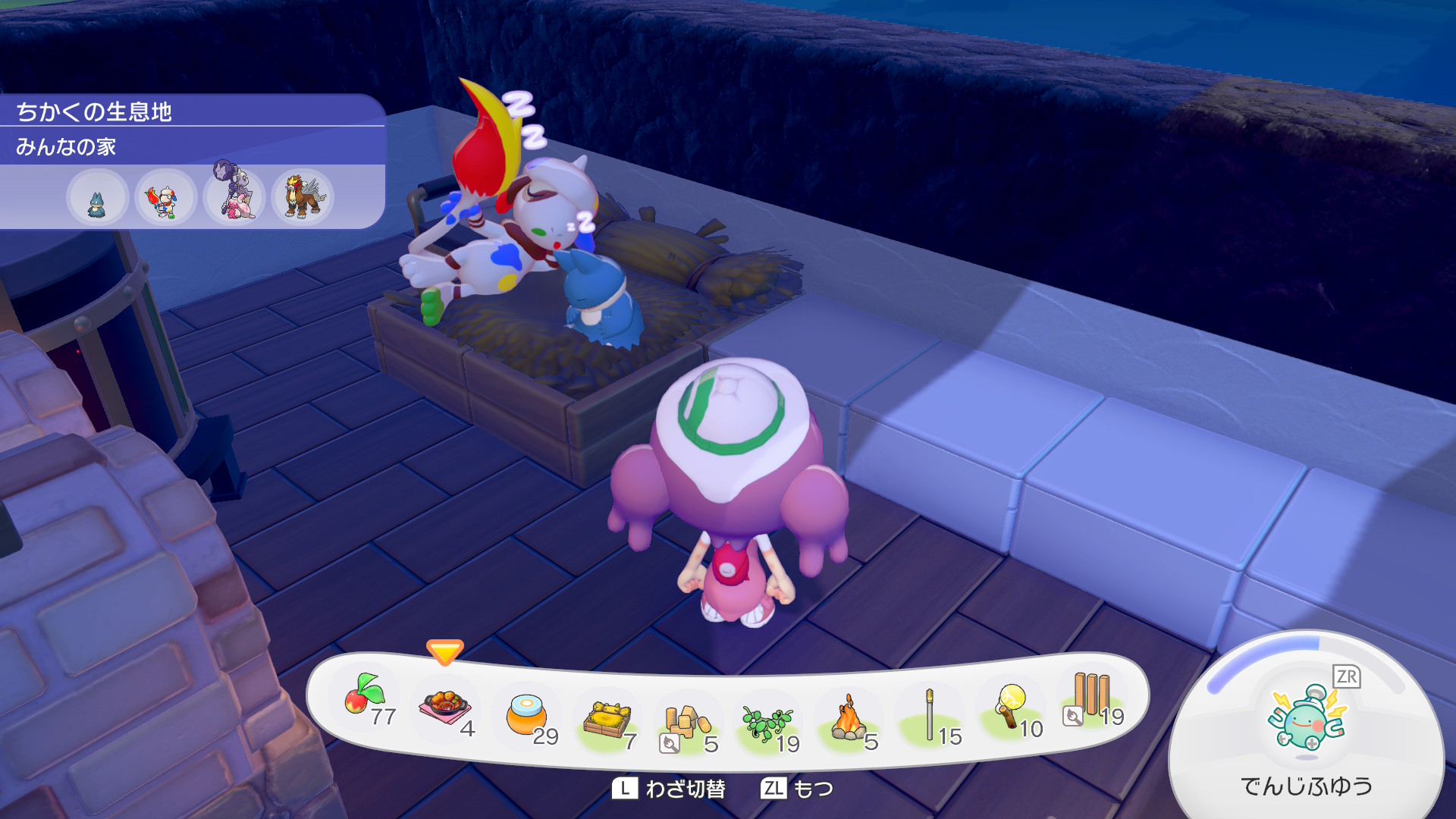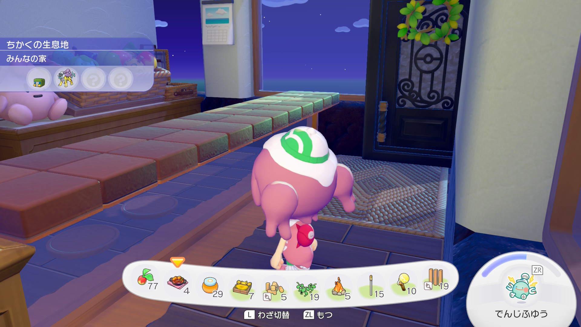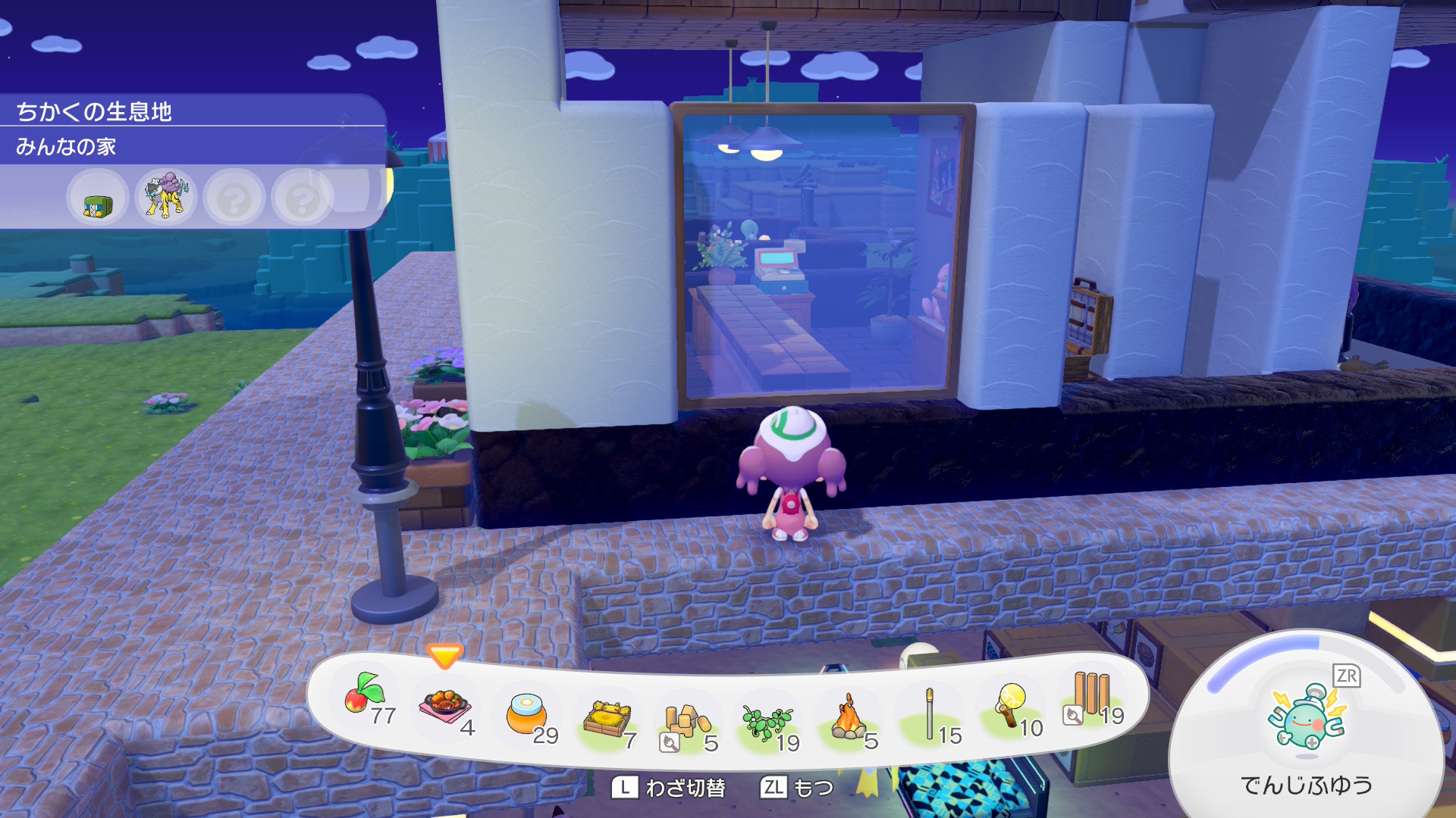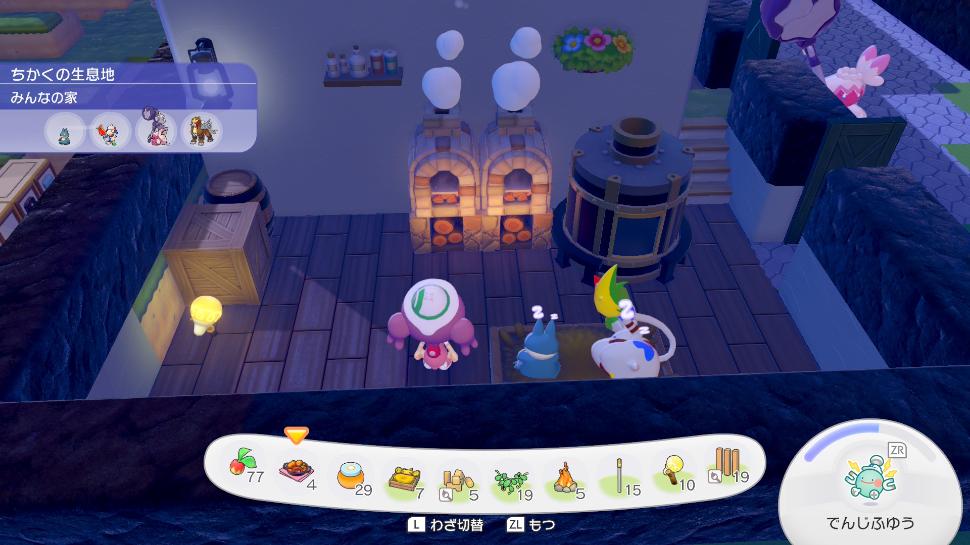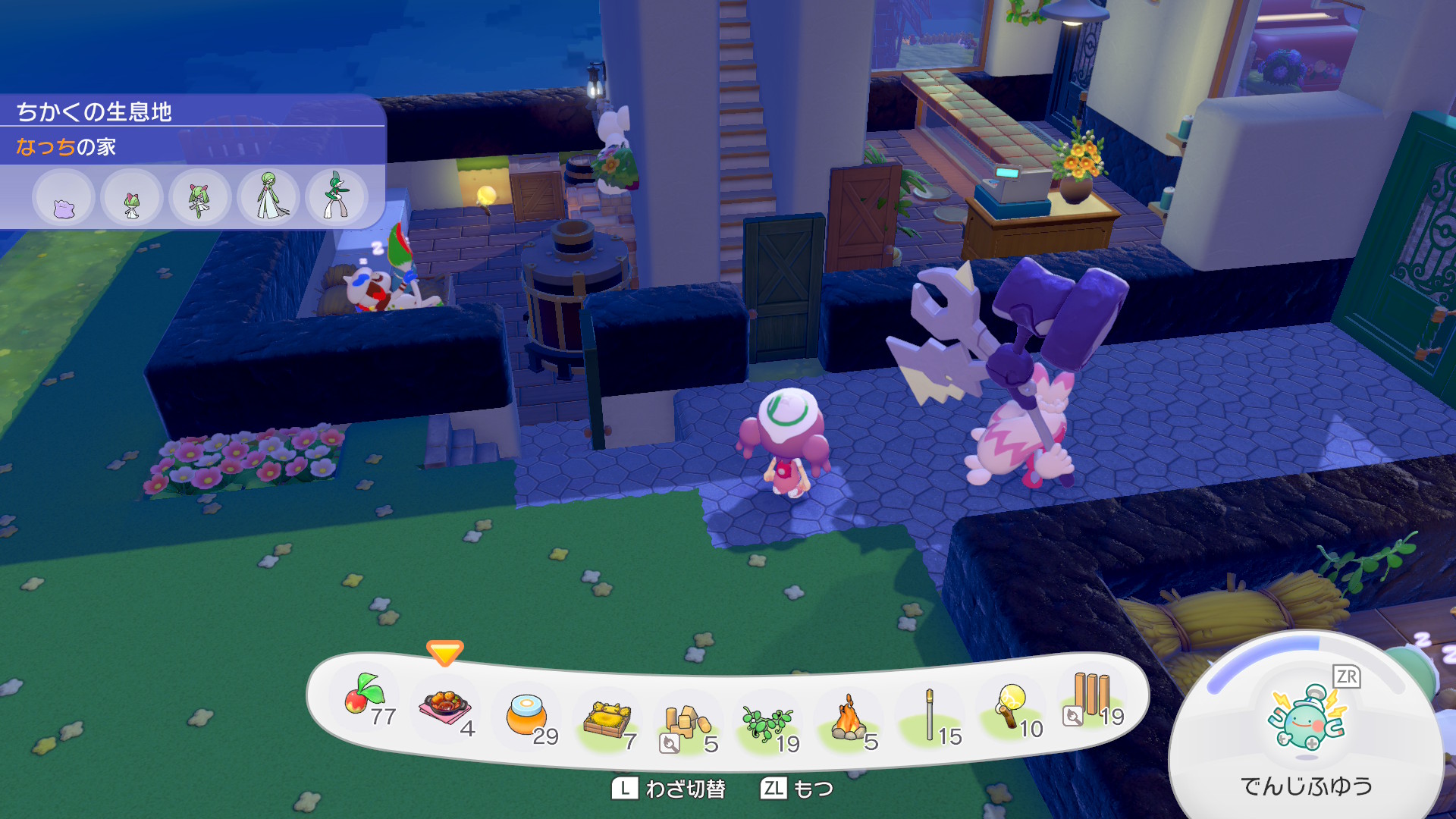 ちなみにパン屋スペースと、その裏のスペース(調理場)、そして手前に見切れている離れの部分ははそれぞれ建物のとして独立の要件を満たしているので、ここだけで12匹のポケモンに住宅を提供できます。ちなみに地下倉庫は住宅の要件は満たしないので一人も住めません。あんなにでかいのに。