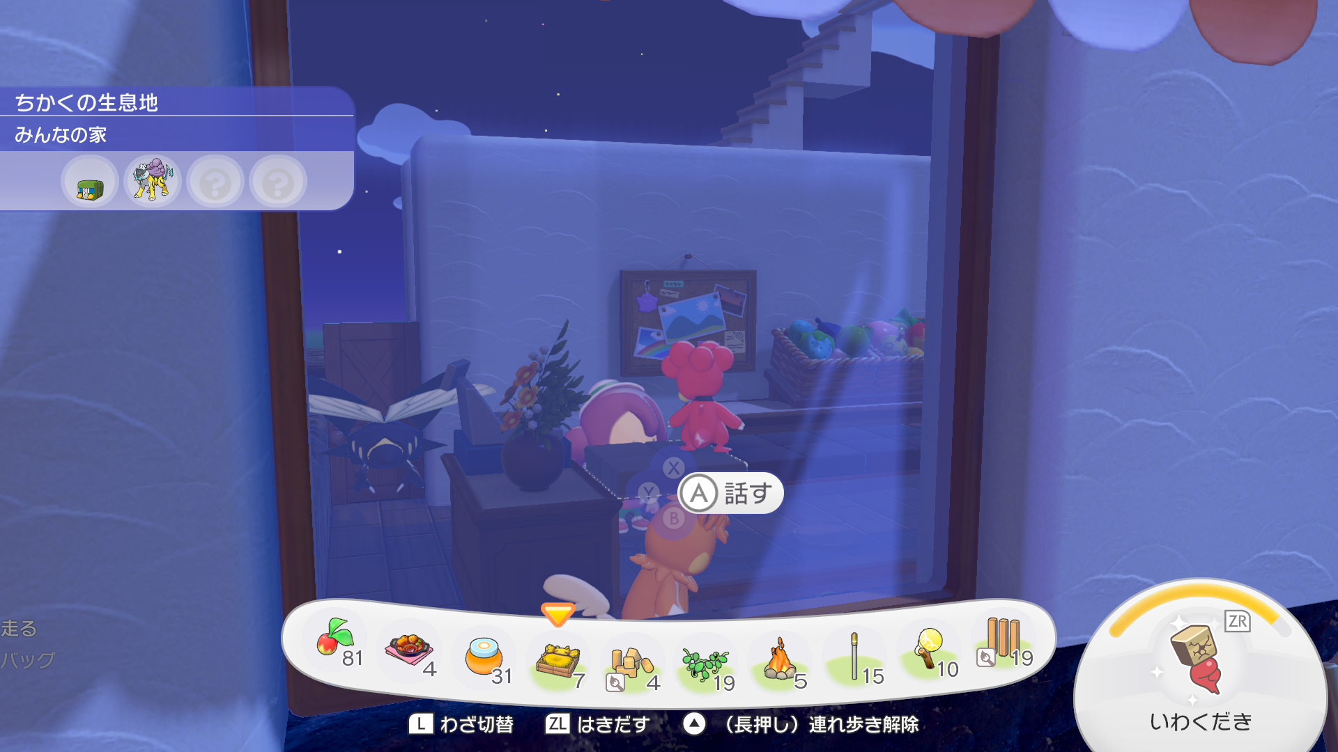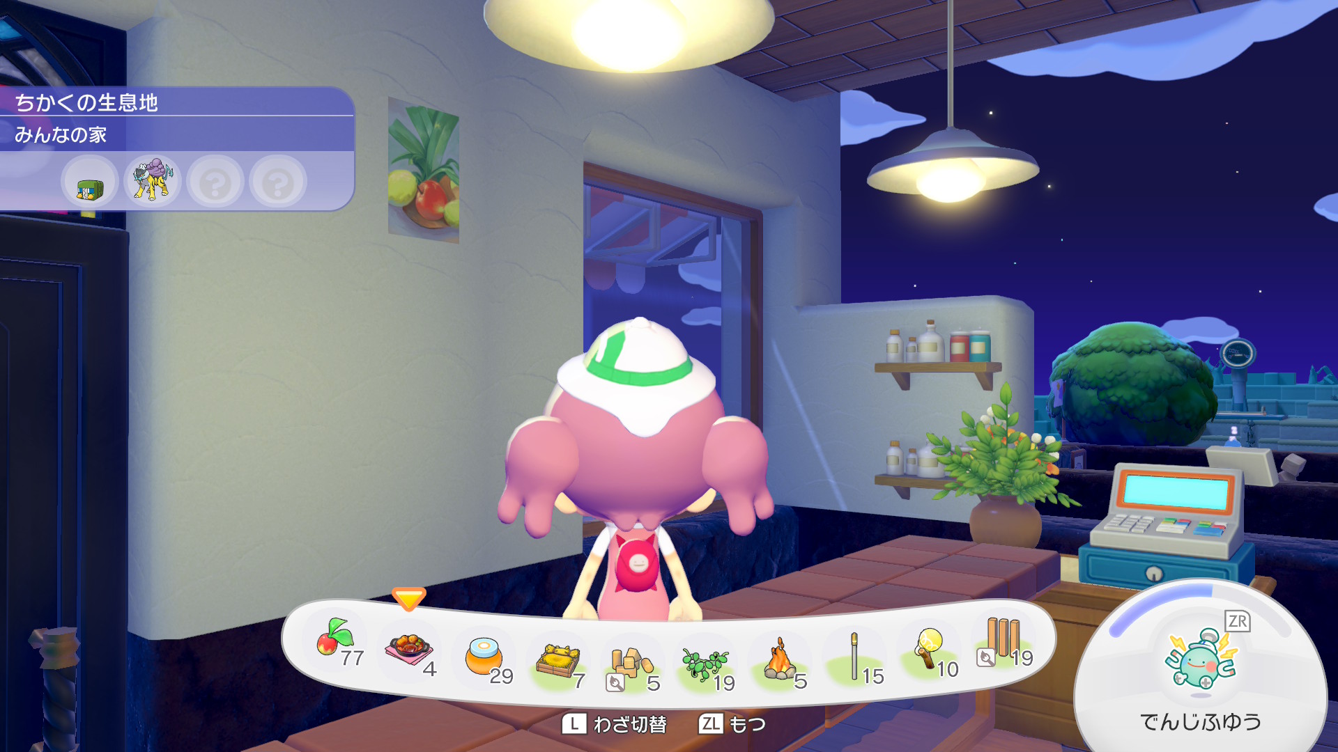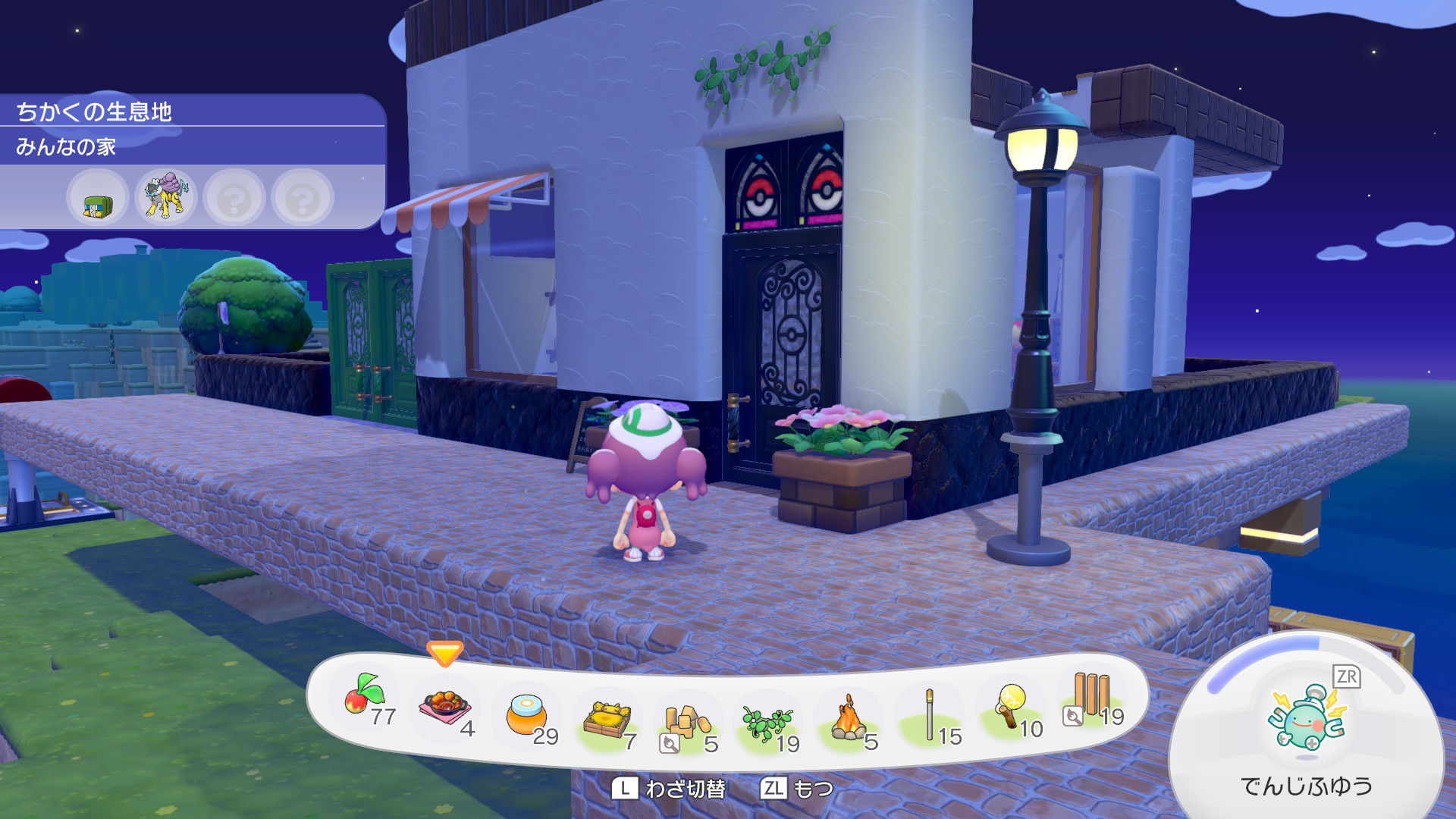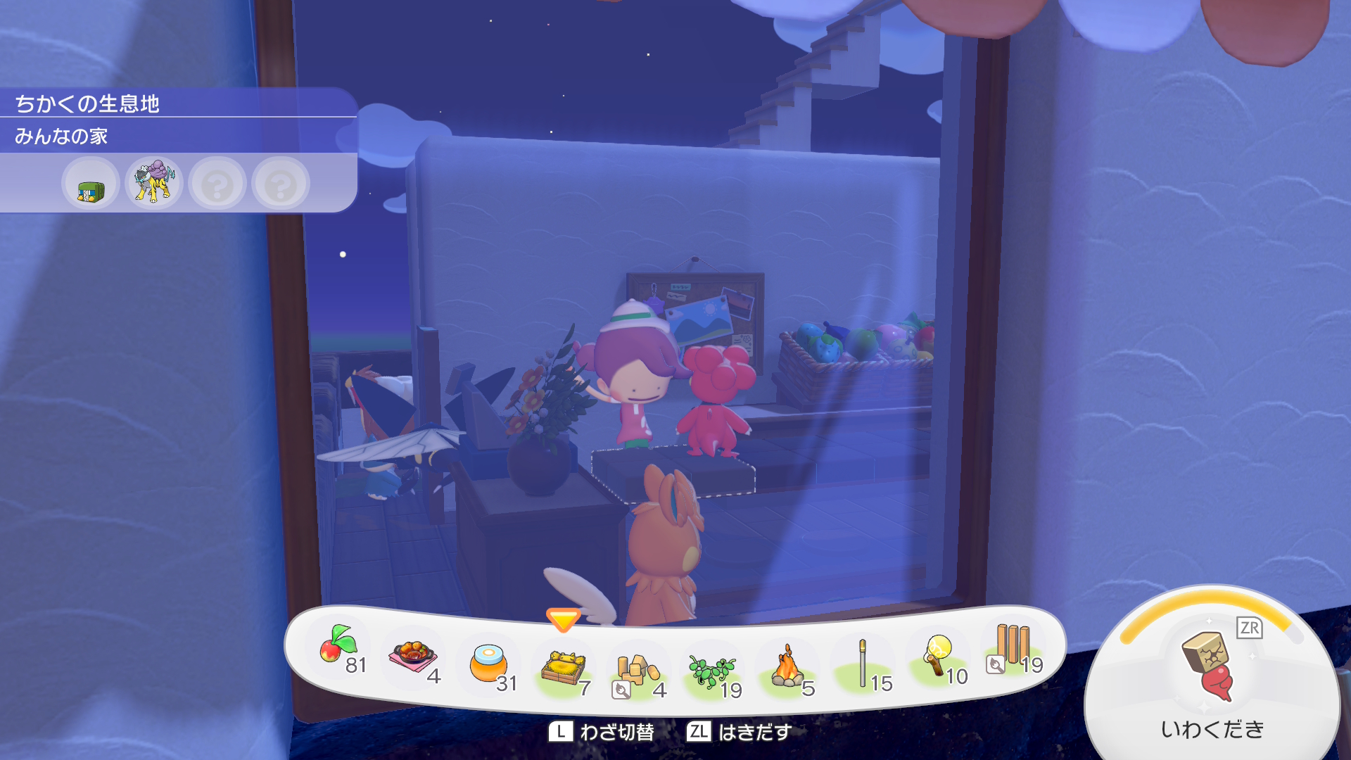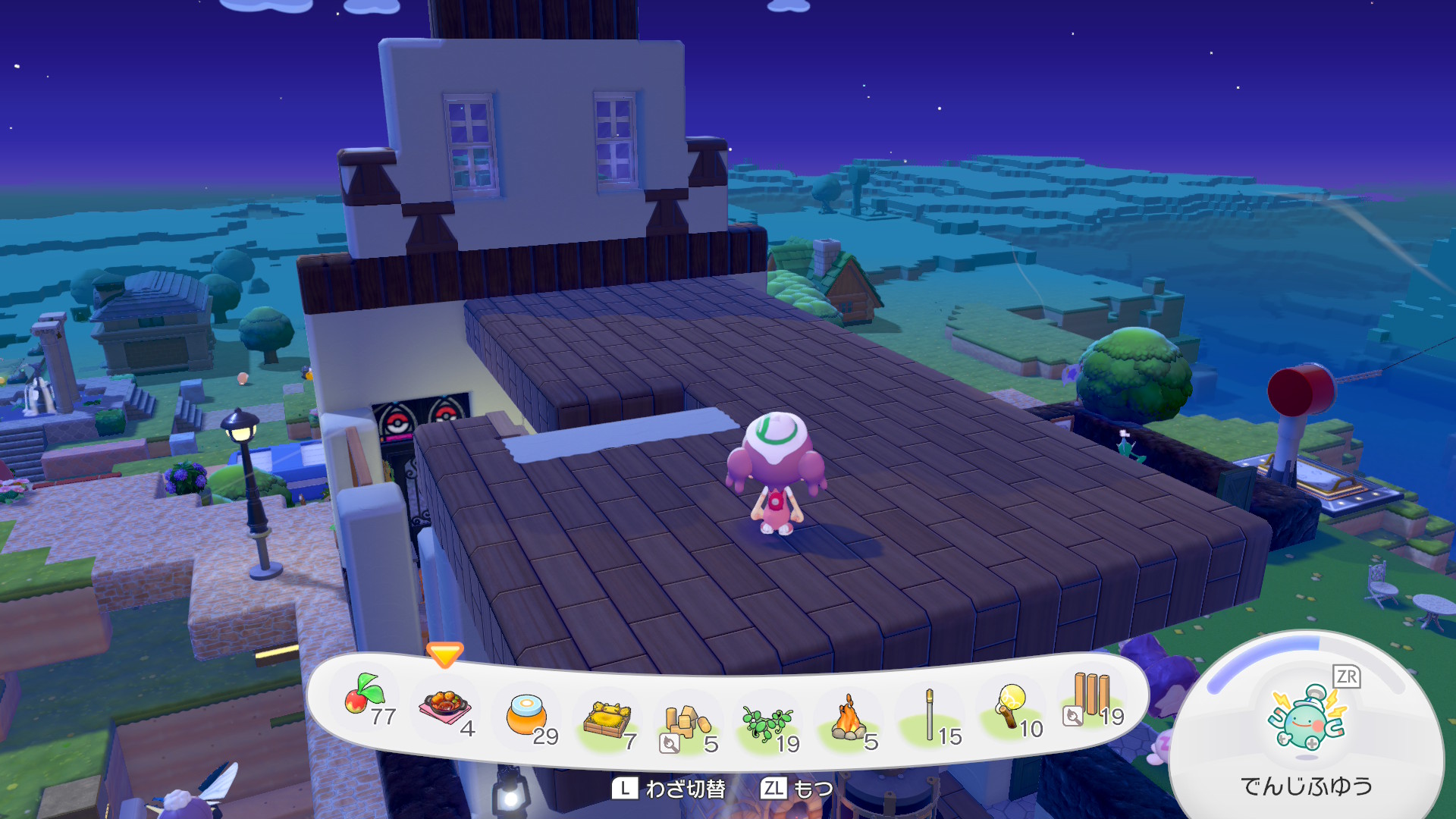 ちなみにパン屋スペースと、その裏のスペース(調理場)、そして手前に見切れている離れの部分ははそれぞれ建物のとして独立の要件を満たしているので、ここだけで12匹のポケモンに住宅を提供できます。ちなみに地下倉庫は住宅の要件は満たしないので一人も住めません。あんなにでかいのに。
