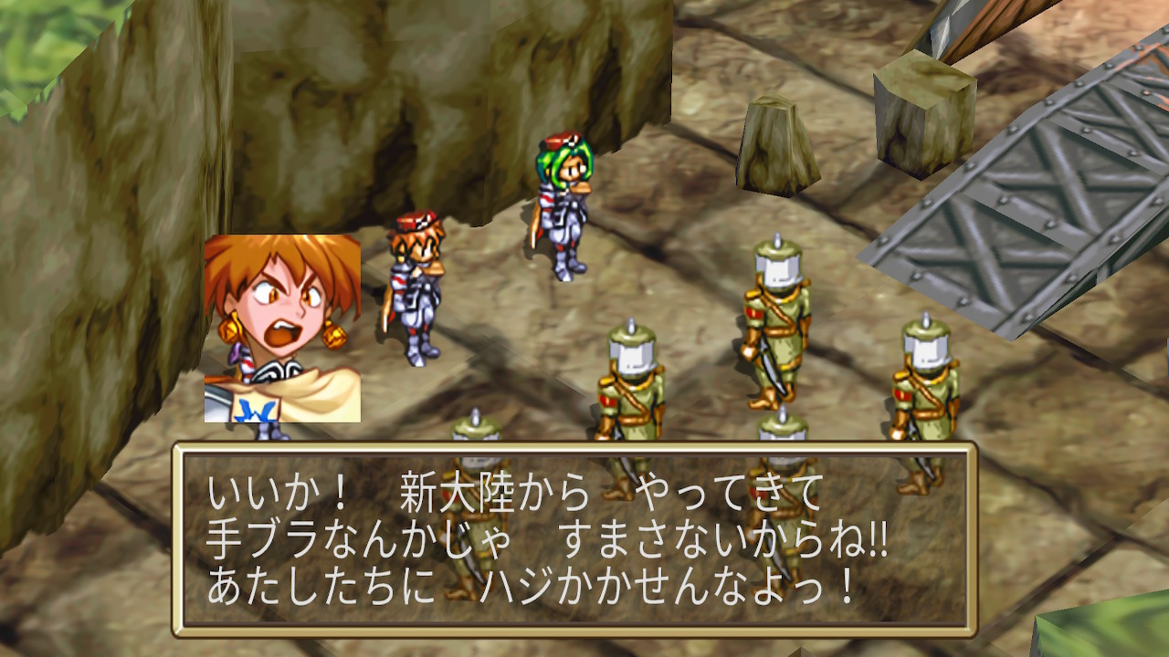 無事サルト遺跡に到着しました。ガーライル軍が絶賛発掘中です。現場を指揮しているのは3人の女性士官のようですね。なかなか活気のあっていい職場じゃないですか。赤い短髪、青い長髪、緑の眼鏡の女性士官…と。魔法騎士かな?(年がバレる発言