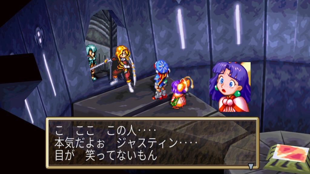 その先には、明らかにこれまでの遺跡と雰囲気が異なる空間が広がっていました。自分の持つ精霊石が俄然本物である可能性が高まったこと、ガーライル軍ですら発見できなかった遺跡を発見したことでジャスティンのテンションもうなぎ登りです。そして最後の封印も精霊石の力で開きました。果たしてこの奥にはなにが…