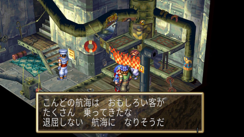 母さんとの別れをすませ、渡航船で新大陸を目指すジャスティン。新大陸までは、蒸気機関を搭載したこの船でも1週間はかかるらしいです。船の中はかなり広くなっているので、しっかり探検しておきましょう。
