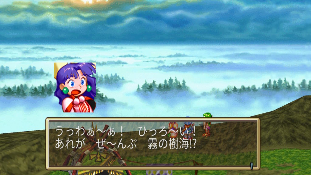 翌朝。フィーナは山脈の向こうに広がる広大な霧の樹海をジャスティンたちに見せます。そしてその向こう…というか、さらに上の方に目を向けると…
