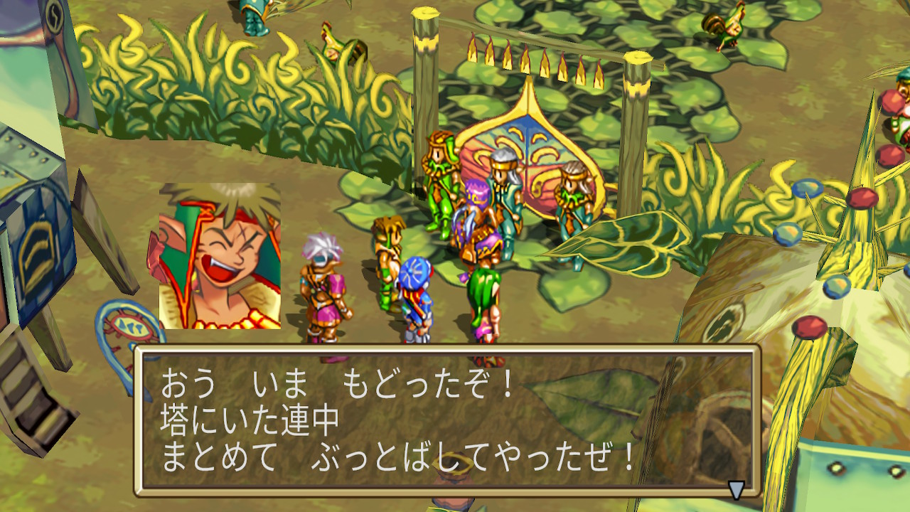 カフーの村の入口では長老が待ちかまえていました。石化の元凶を倒し、石化を解くヒントも見つけてきたわけですし、これは今晩は祝勝パーティですかね?