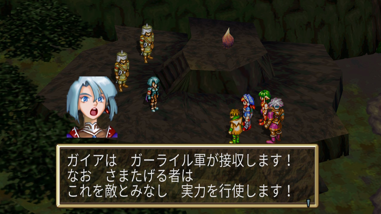 村に戻ると、既にガーライル軍が大暴れしていました。どうやらガイアの芽を取り戻しに来たみたいですね。目撃者は全員消した(※石化しただけです)はずなのに対応早いなと思いましたが、3人娘のせいか。長老もジャスティンたちが村に入ることは見逃してくれました。見逃す?ここは土下座して協力をお願いすべき場面なんじゃないですかね!?(ジャスティンはそんなこと言わない