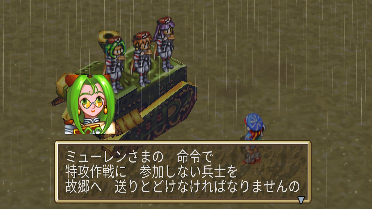 野戦キャンプ地は重苦しい雰囲気に包まれていました。リーンの死を嘆く者、ガイアの強さに絶望する者、最期を故郷で迎えようとする者…。そしてミューレンは、少数の兵と共に、リオンロットで最後の特攻をかけようとしていました。