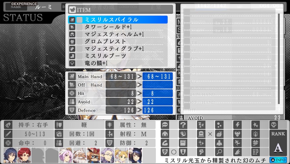ステ振りはVITを15まで振り、残りはMYSへ。今作は回復が後手に回っても生存率に大差ない場面が多い(後手に回っても間に合うくらい火力が低いか、先手を打っても一発で全滅するくらいの高火力攻撃が来るかのどっちかなので)ので、AGIには振らなくても大丈夫でした。