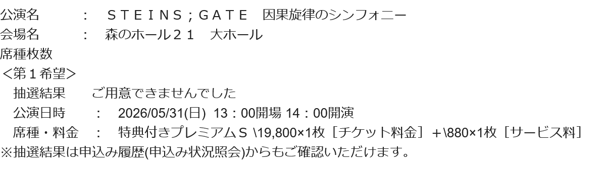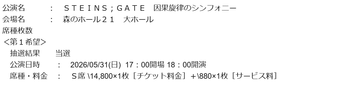 シュタゲコンサートの抽選結果が届きました!