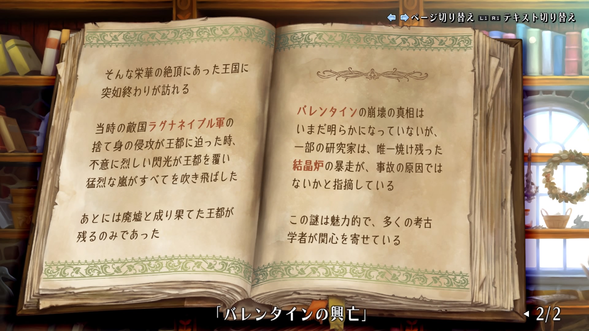 途中で拾える古文書によると、バレンタインはラグナネイブルとの戦争中に、謎の閃光と嵐により崩壊したとか…。