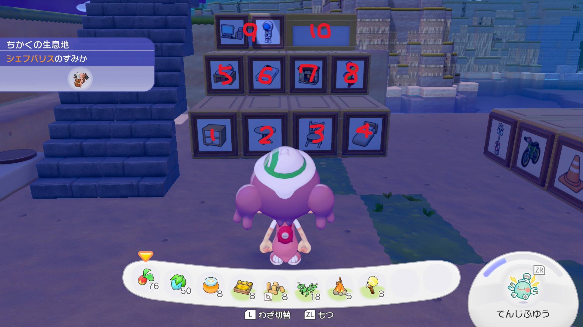 またゆめしまに行くためのぬいぐるみも並べています。ゆめしまに行くにはフワンテが必要なのですが、フワンテは、主人公がぬいぐるみを調べるだけで、どこの街にいてもやって来てくれるので、まっさらな街にあらかじめ移住させる必要はありません。