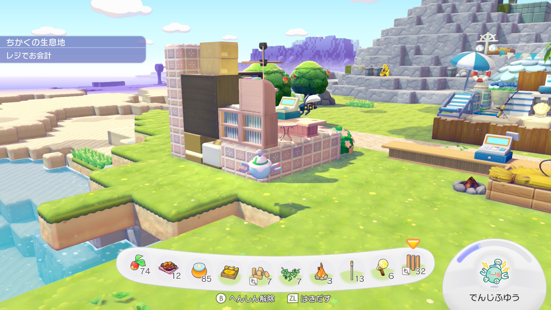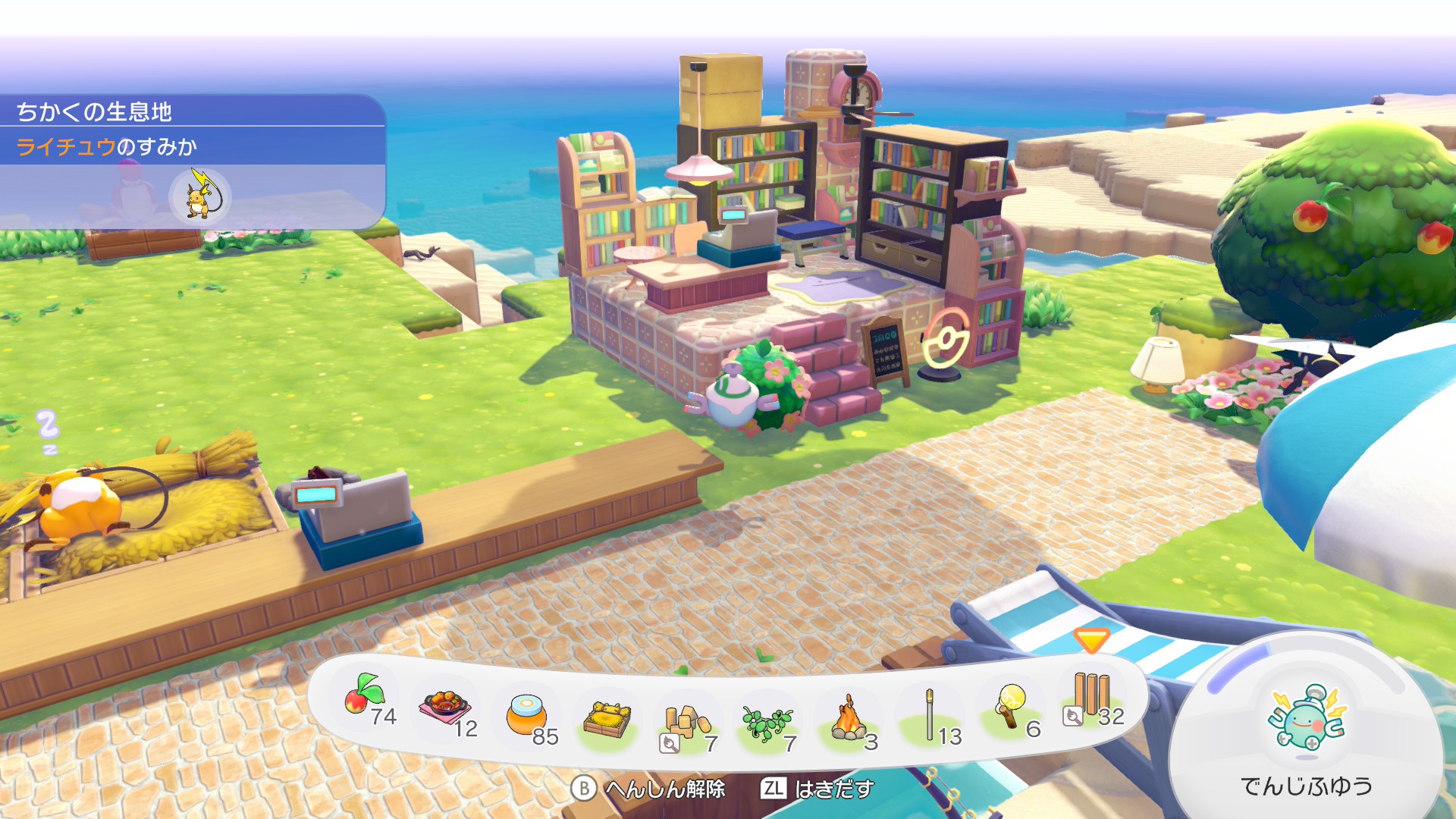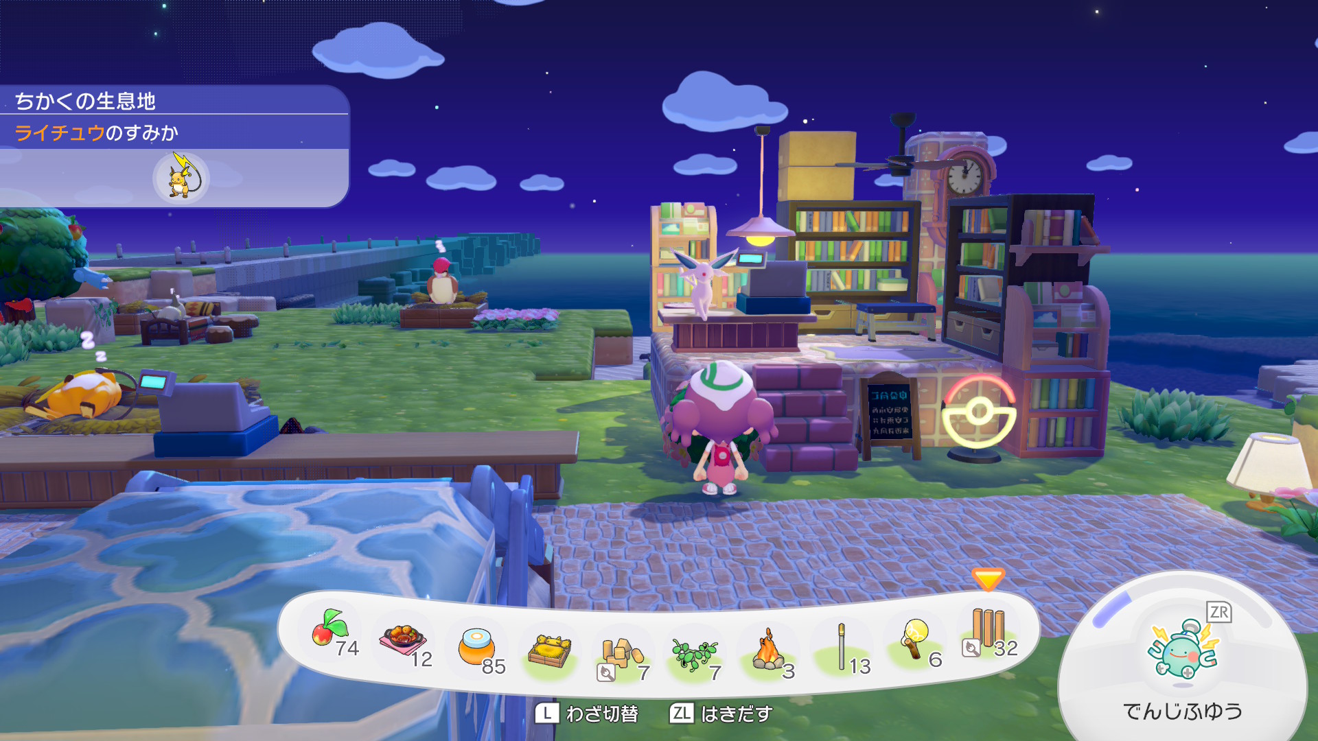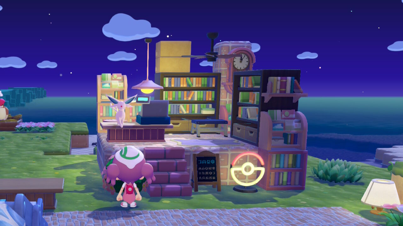 シャワーズ同様、裏側に「すなのおうち」を建てて、エーフィとミュウの住処にしようと思っています。ある程度ゴージャス感がある部屋で、本を自由に読めるようにしています。サイコキネシスで読みたい本を空中に固定しているという設定。あと正面のポスターはエーフィのシンボルである太陽が描かれているものにしました。