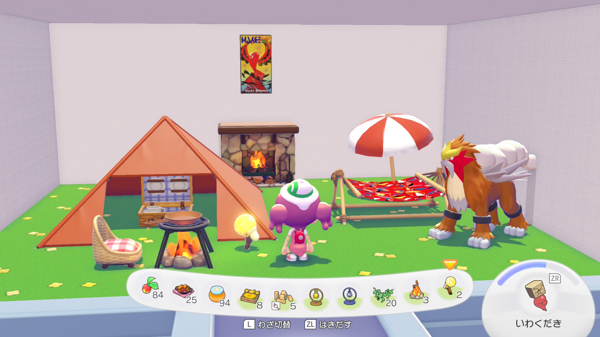 中はこんな感じで、穏便な感じのキャンプスポットにしました。暖炉はキャンプファイヤー代わりです。本当は溶鉱炉を設置してエンテイさんにはひたすらレンガを作っていただきたかったのですが、あいにく建物内には溶鉱炉を設置出来ないようです。残念。