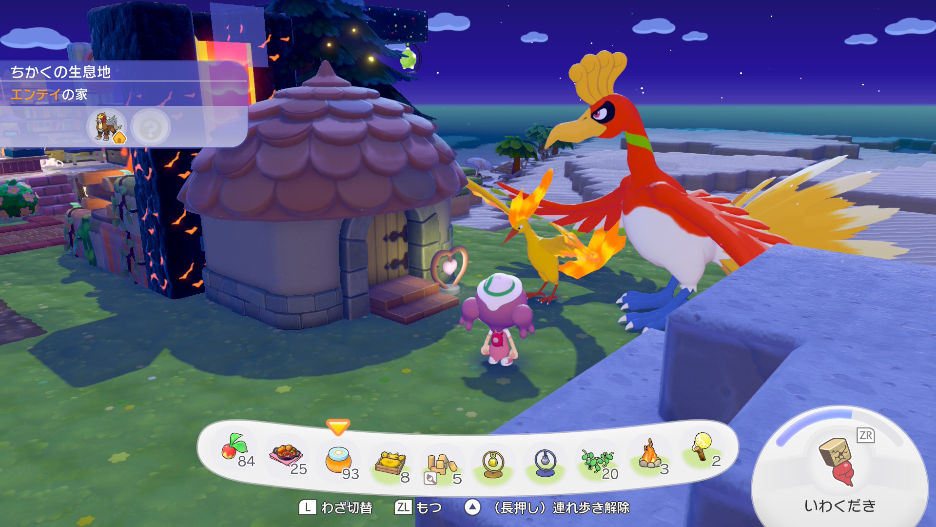 完成後、いつも通り裏側に家を建てることにしました。ホウオウさんもお祝いに駆けつけてくれたのですが(嘘です。鈴で呼びつけました)、ホウオウはここに住むことができないので、代わりに同じ火の鳥のファイヤーさんに住んでもらいましょう。