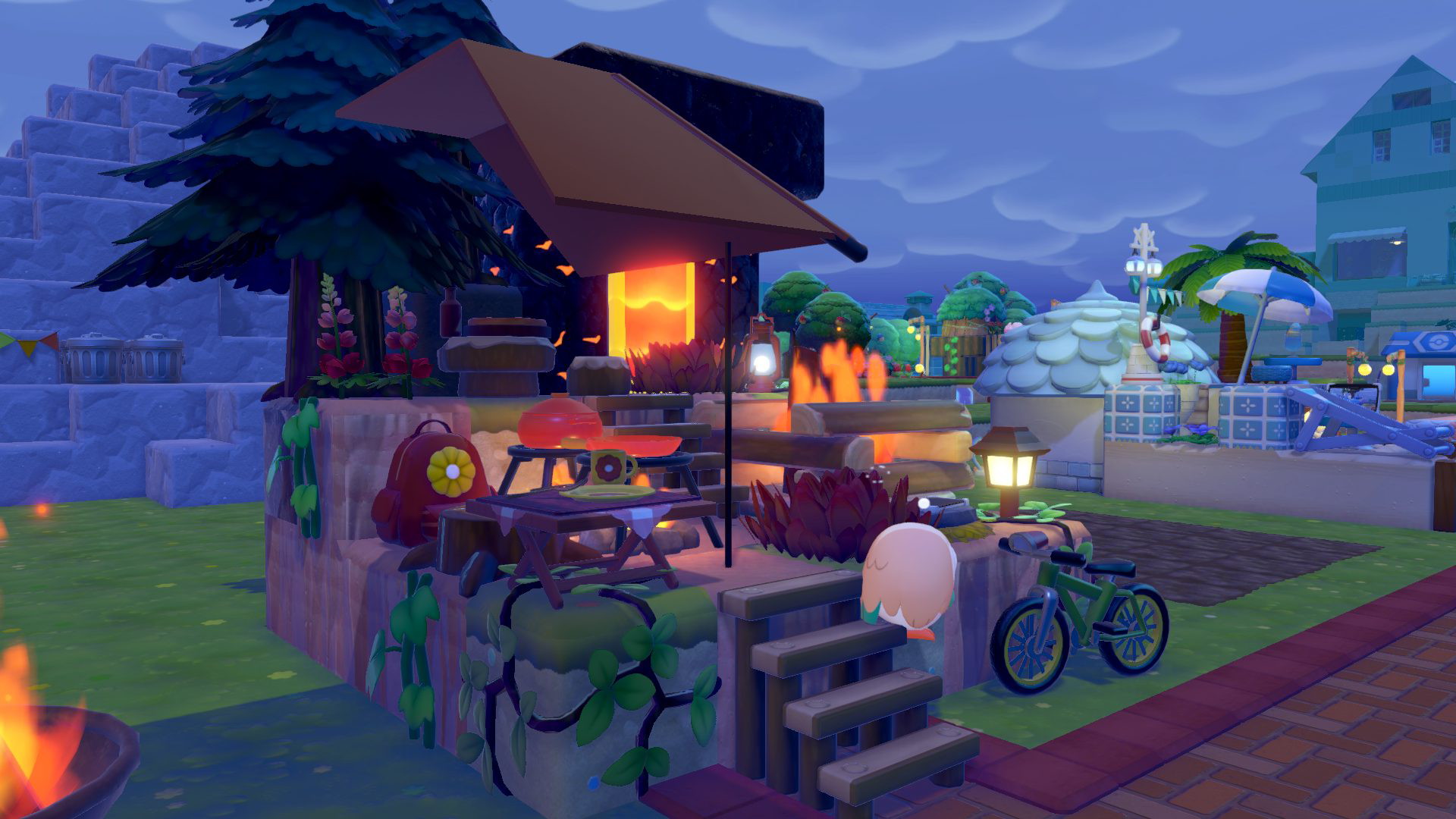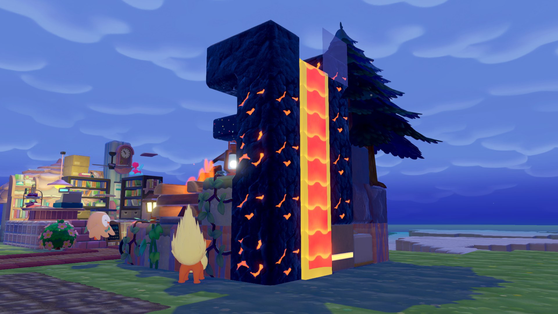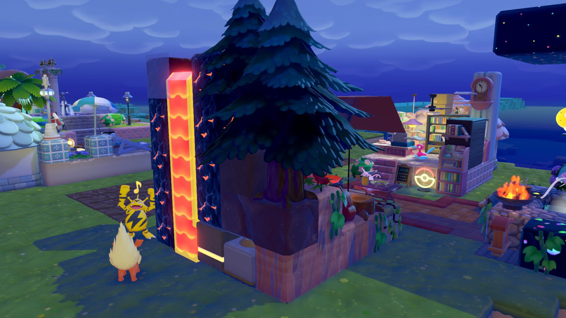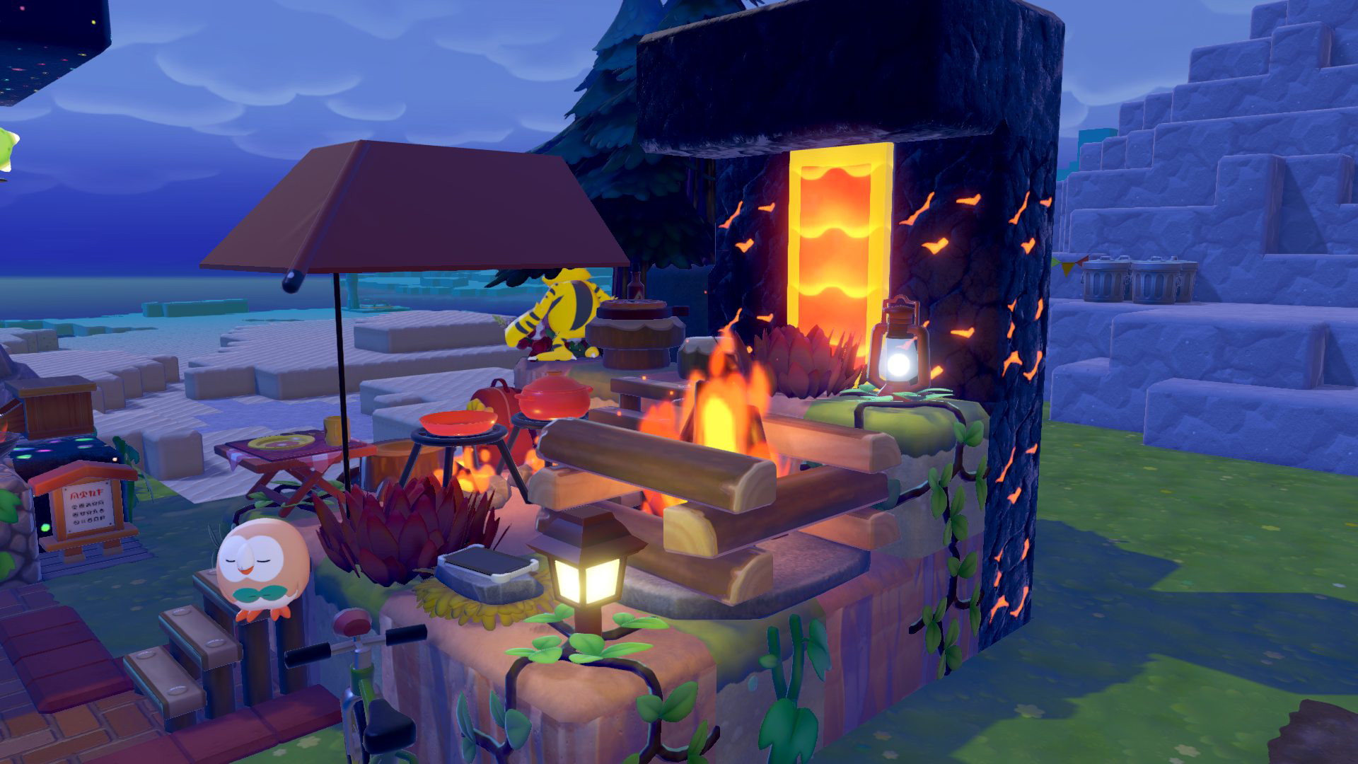 こんな感じになりました。最初は背景は爽やかな滝を流していたのですが、「炎が…赤さが足らない」ということでマグマを流すことにしました。マグマの扱いに慣れてなかったせいでうっかりマグマが周辺に溢れてしまい、キャンプ所ではなくなりましたが…2件向こうのシャワーズのうみべリゾートが温泉リゾートになるところだった。