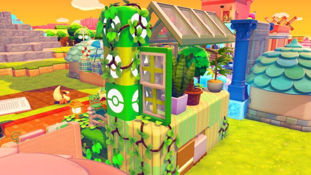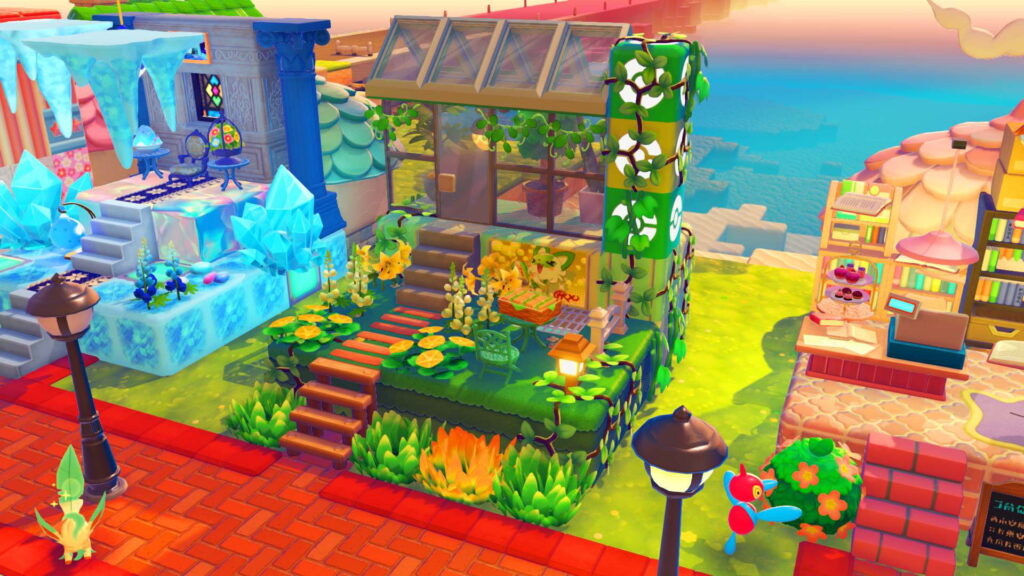 今回はもともと緑のものが多いので、ペイントは必要最小限で済みました。リーフィアイメージなので緑と黄色を組み合わせています。奥が植物園で、そこにつながるボタニカルガーデン…みたいな感じにしました。植物園の中を作ることも考えたのですが、参考にさせていただいたものより可愛く作れる自信はなかったので…