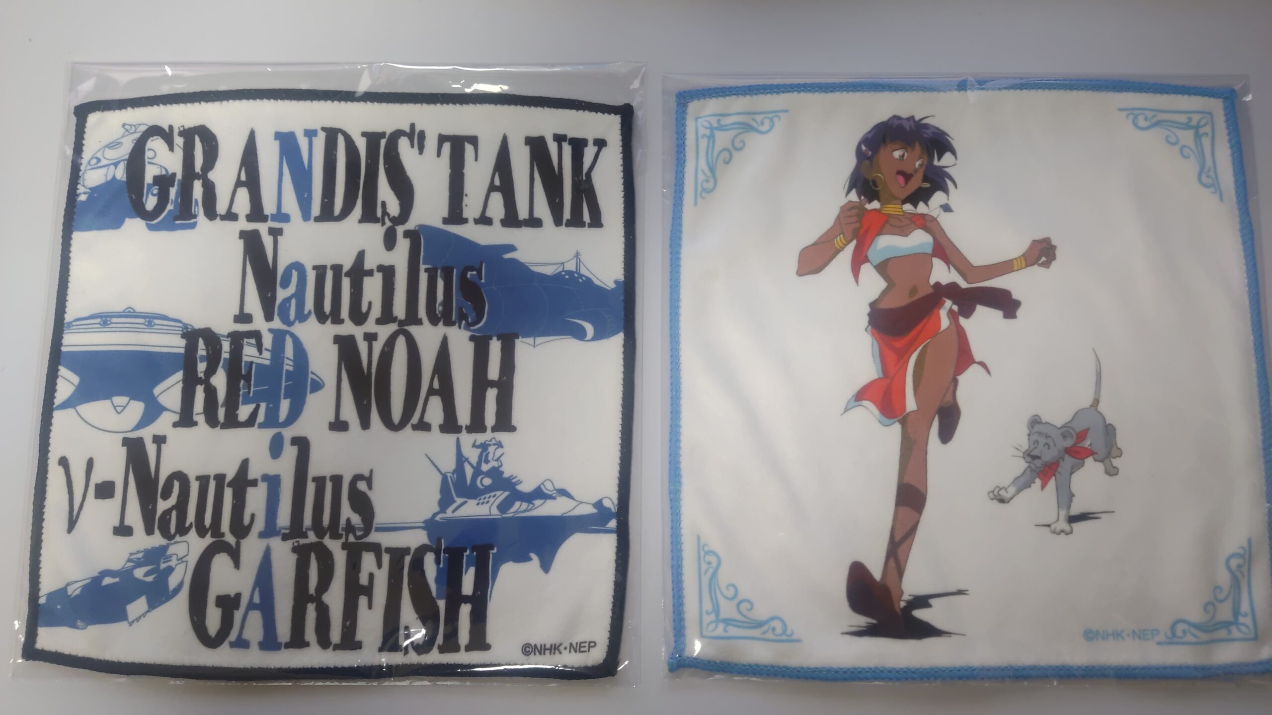 ハンドタオル2種。メカバージョンとナディアバージョンです。裏は無地なのがちょっと寂しい。でもちゃんとΝ-ノーチラスのΝが、アルファベットのエヌではなく、ギリシャ文字のニューになっているのは評価したい(知ってました?)。