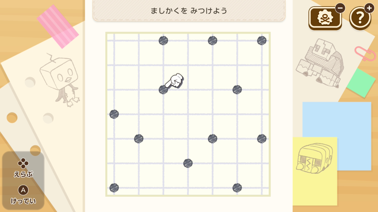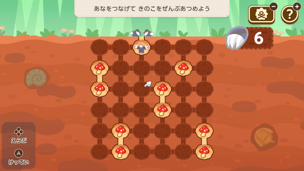 指定個数の穴を開けて、スタート地点から全てのキノコの穴にたどり着けるようにするミニゲーム。難易度は低いですが、時々予想外の難問が紛れていることが。