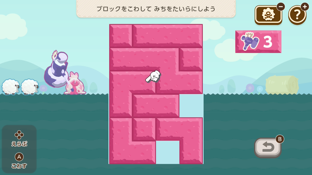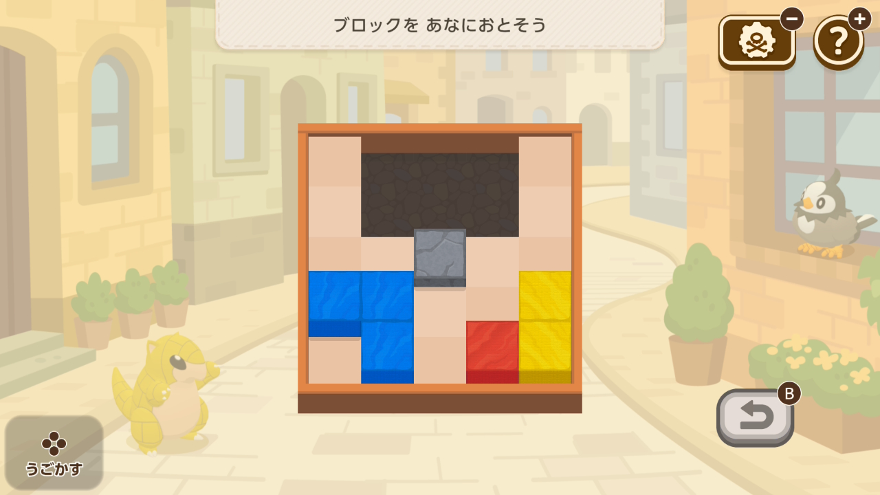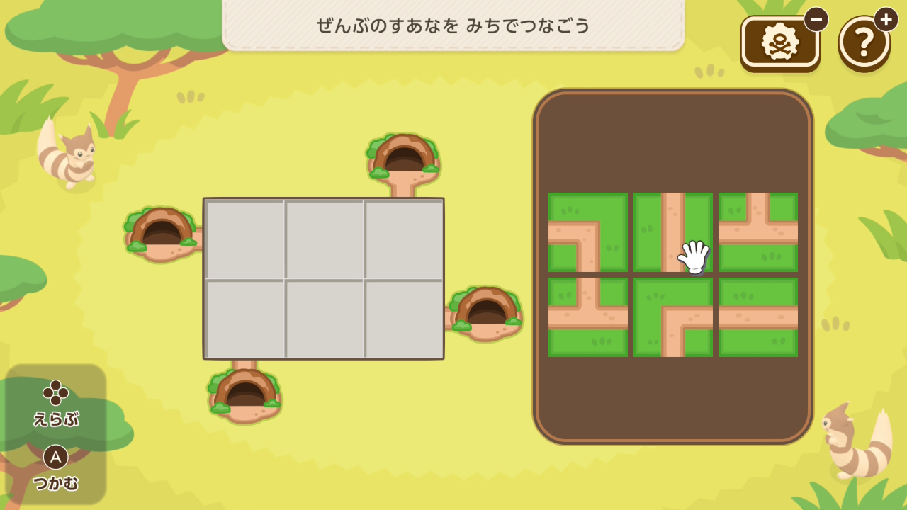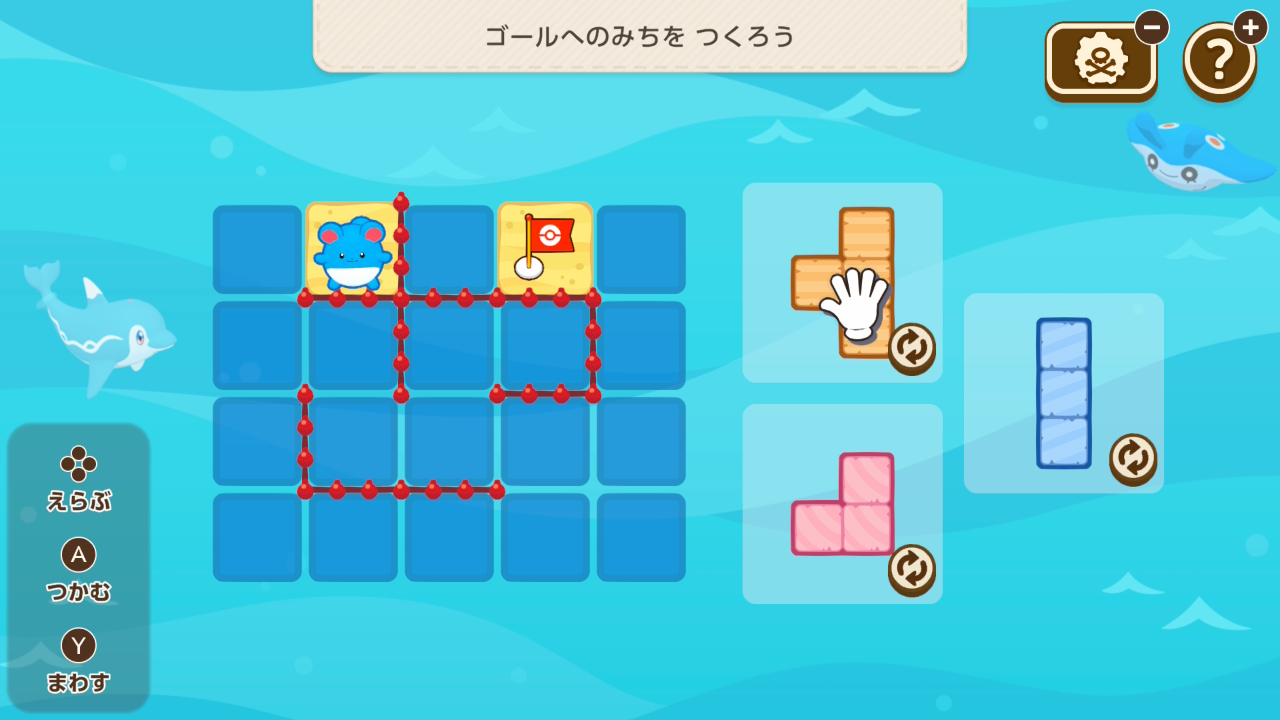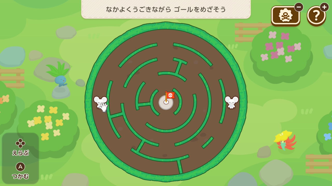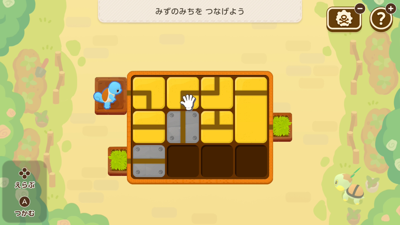 黄色いブロックをスライドさせ、ゼニガメから全ての植物まで水を流すミニゲーム。制限時間がタイトでしたが、アプデでかなり楽になりました。