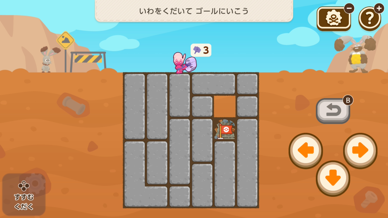 - 時には、どうやってゴールマスに入るか逆算する(↑だと、ゴールマスに右側から入ろうとすると、ゴールの下にある岩を砕いてゴールを落とす以外にはないが、3回の行動でゴールの下にある岩を右側から砕くのは不可能なので、左側から攻めないと行けないことが分かる)