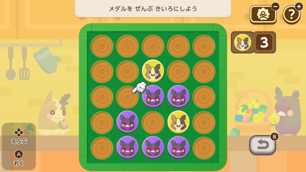 規定の枚数の黄色いメダルを置き、オセロの要領で全て黄色いメダルにするとクリア。難易度は中程度。