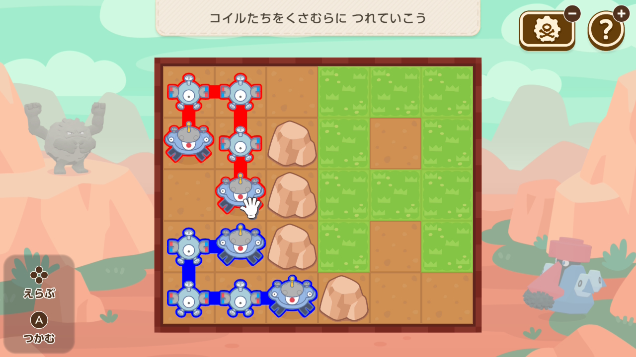 引っ張るしかできないコイルの列を全員芝生に乗せるミニゲーム。アプデ前は制限時間になかされましたがだいぶ楽になったかな。どのコイルから移動させるか、芝生の上に各列をどのように並べるか、どのルートで引っ張るかなど考えることが多い!