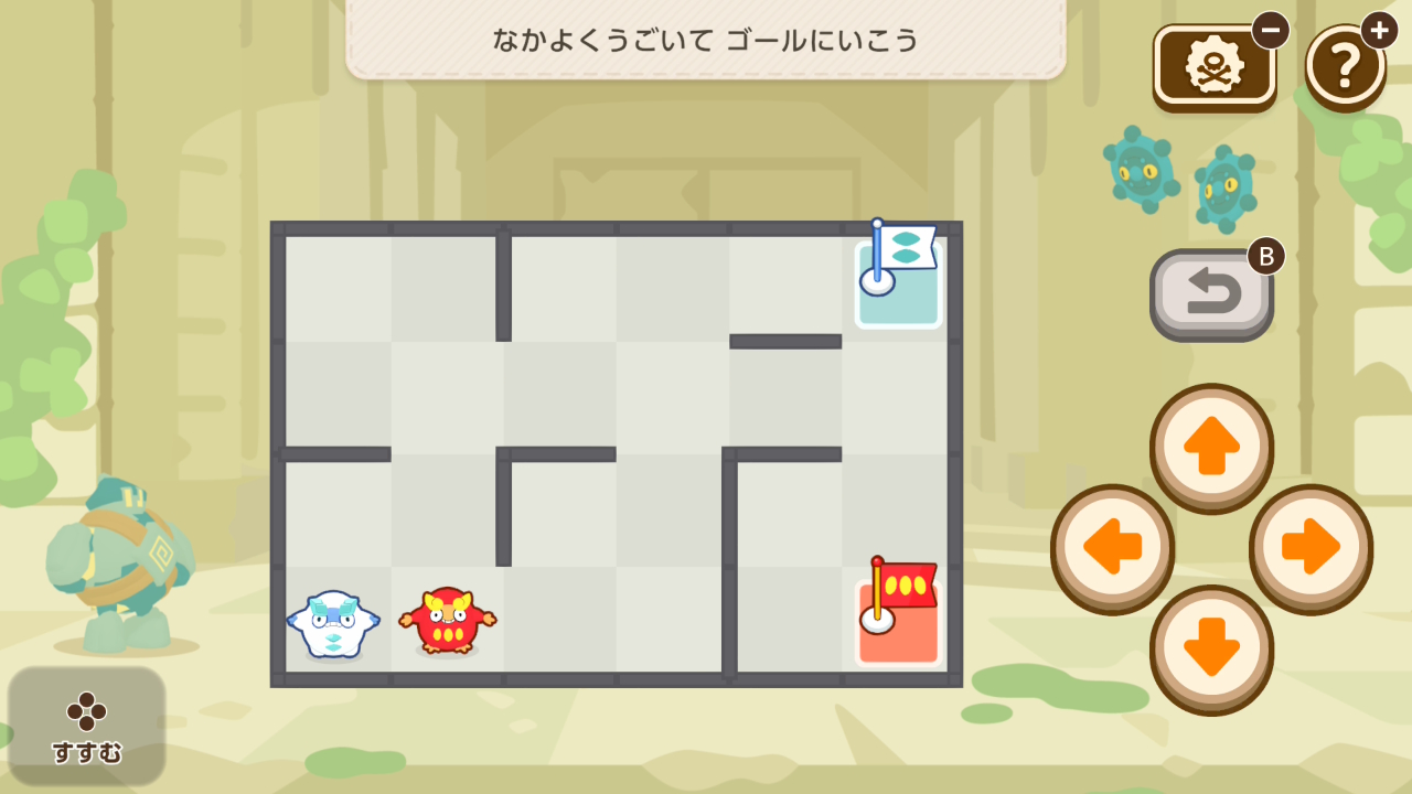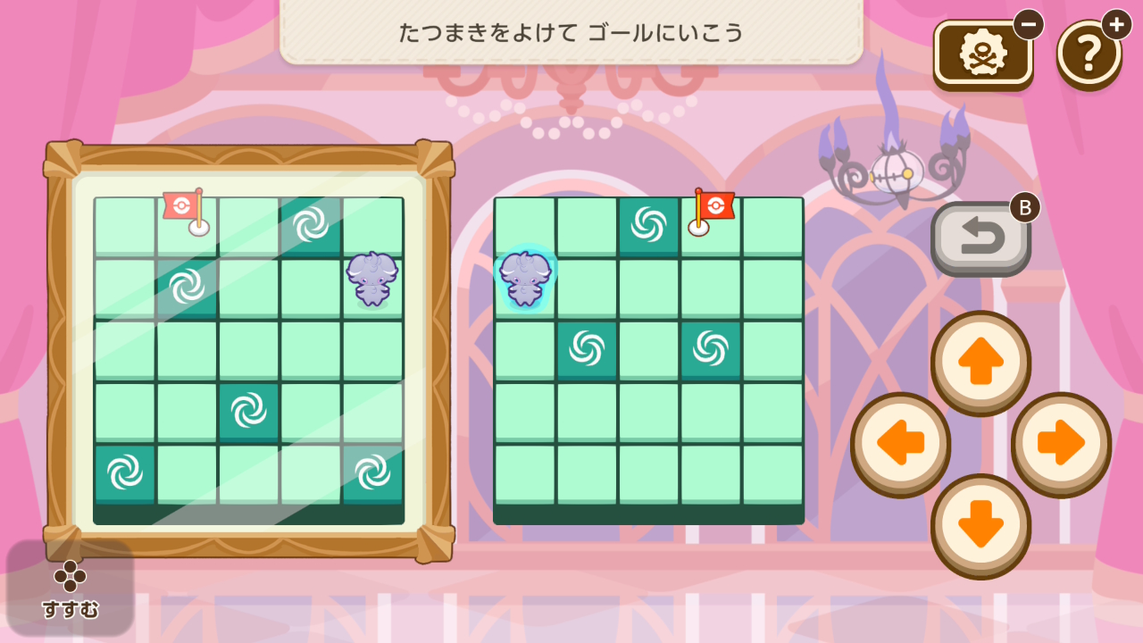 ニャスパーと、鏡に映ったニャスパー両方がたつまきのマスを踏まないようにゴールに導くミニゲーム。難易度は低め。