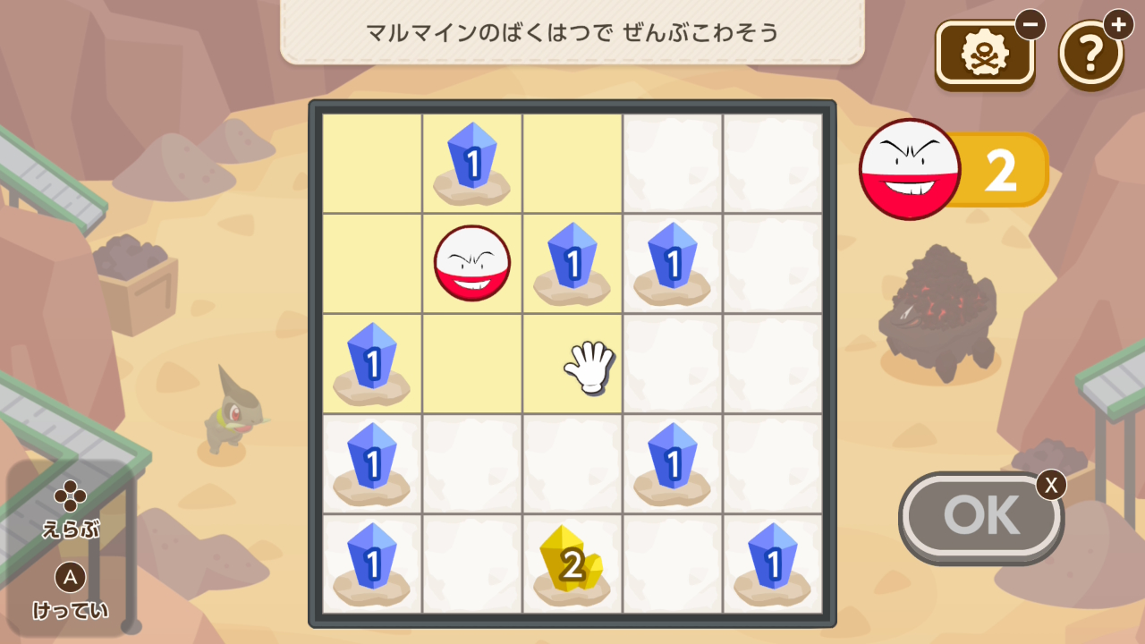 周囲8マスの結晶を破壊出来るマルマインを配置し、全ての結晶を破壊するミニゲーム。時々難問がありますが全体的に低めの難易度。