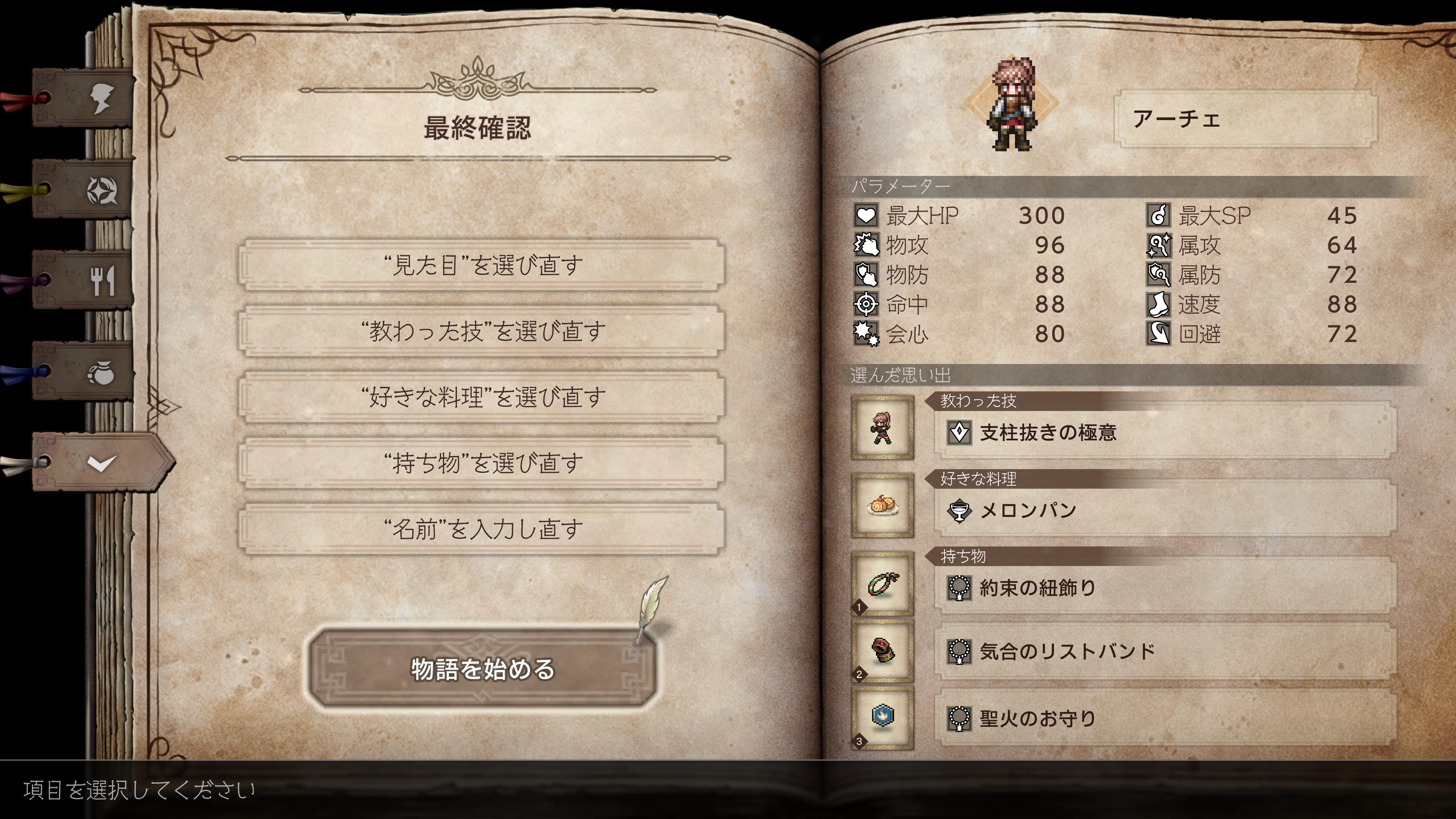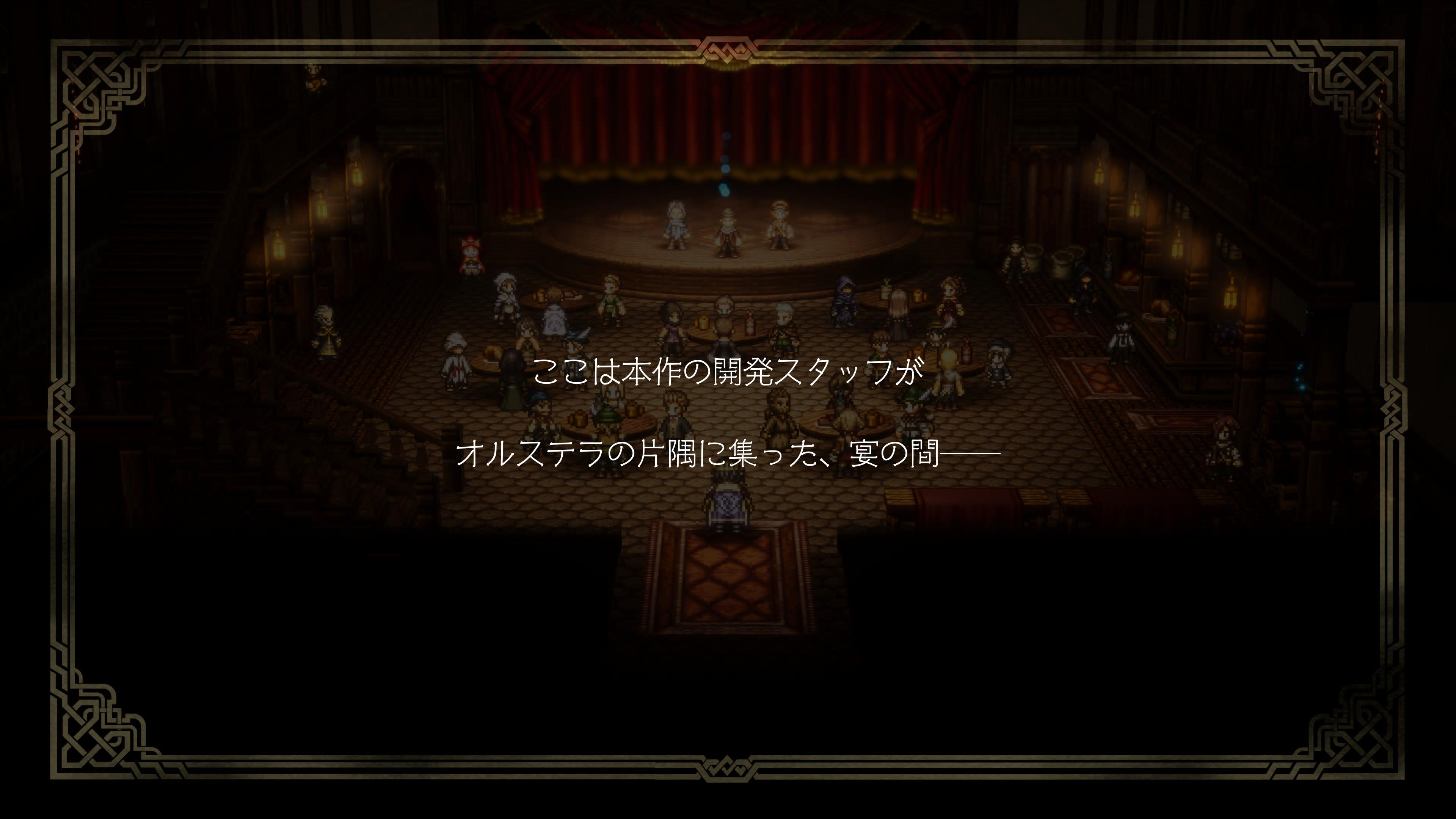 - 過去作では8人の主人公によるオムニバス形式になっていましたが、今作はキャラクターメイキング出来る主人公が1名存在し、その主人公の目を通した物語になっています。主人公はいわゆる無口キャラで選択肢でしか喋らず(戦闘中は喋ります)、自らストーリーを引っ張っていくというより起きた事件に巻き込まれていく側面が強いのですが、”選ばれし者”という、この世界では非常に特殊な存在であることからその存在感はしっかり描かれており、他のキャラに埋没してしまうと言う事はありませんでした。