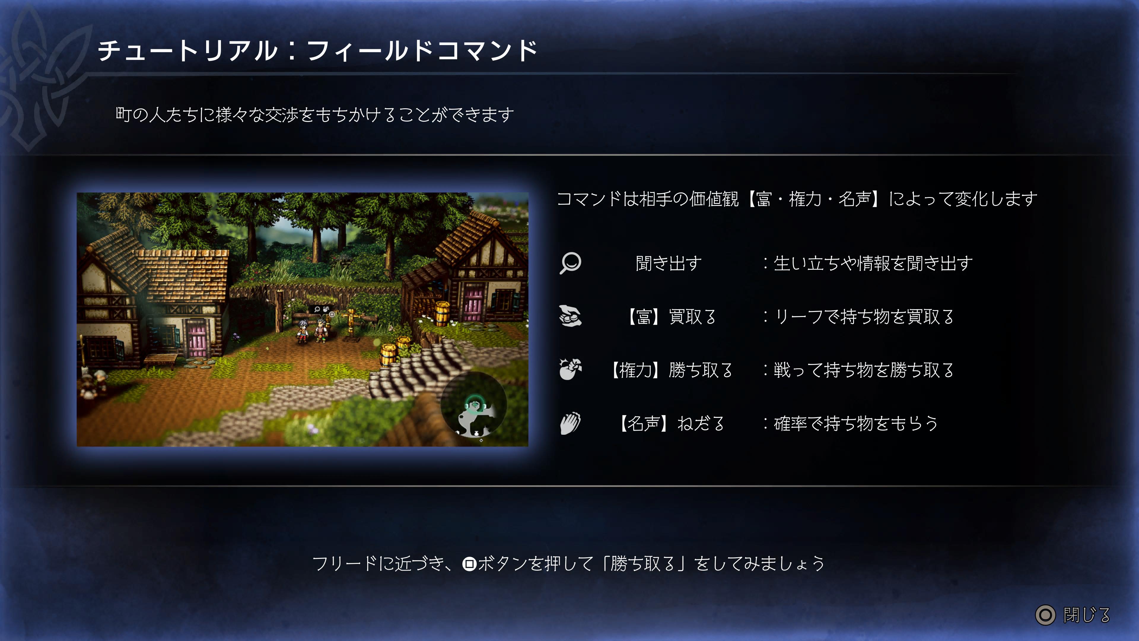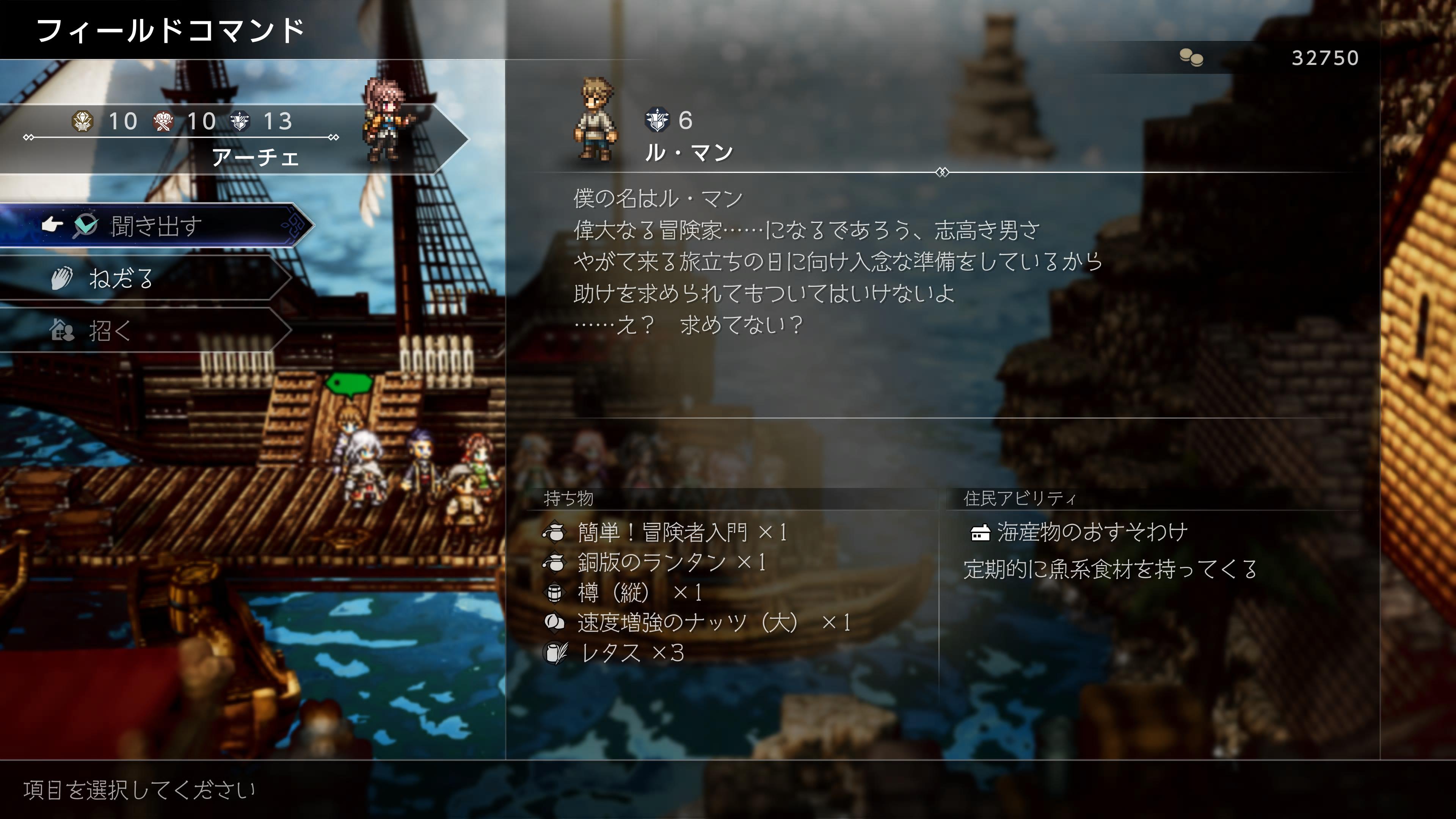 - それからシリーズ恒例の「フィールドコマンド」というシステムがあります。これはマップ上にいるNPCに行使することで、そのNPCの情報を入手したり、アイテムをもらったり、ウィッシュベールの住民として招いたりすることが出来ます。過去作では主人公ごとに別の能力を持っており、パーティを頻繁に組み替える必要がありましたが、今作では主人公に能力が集約されているので使いやすくなりましたね。