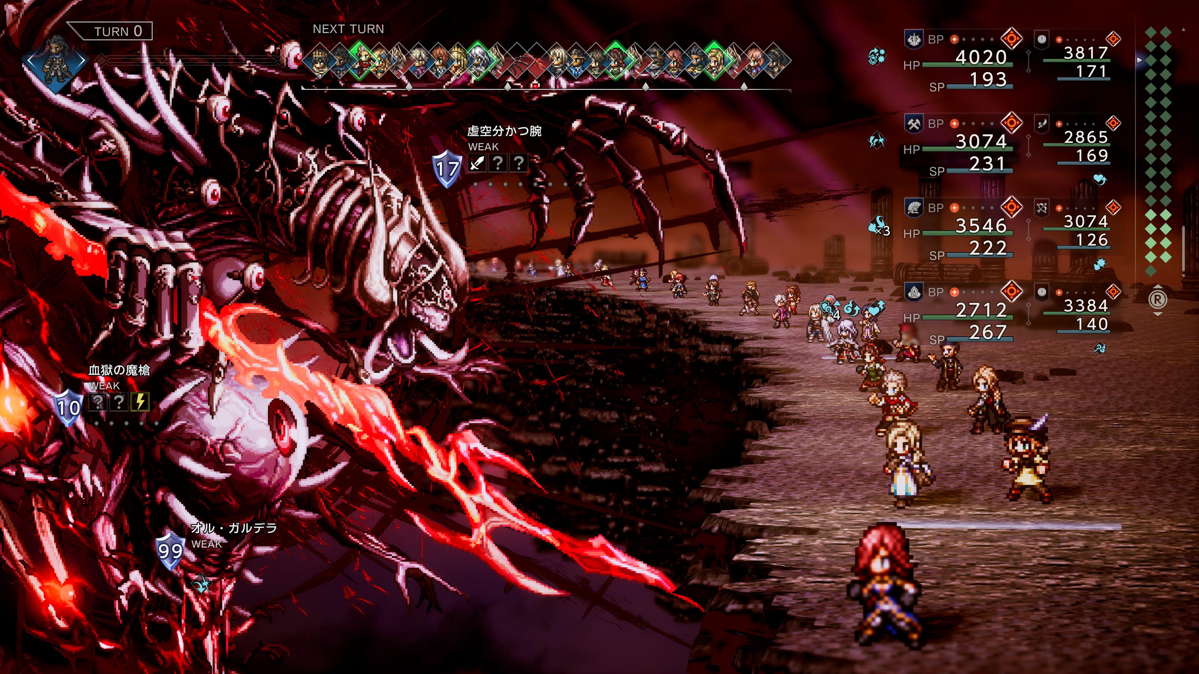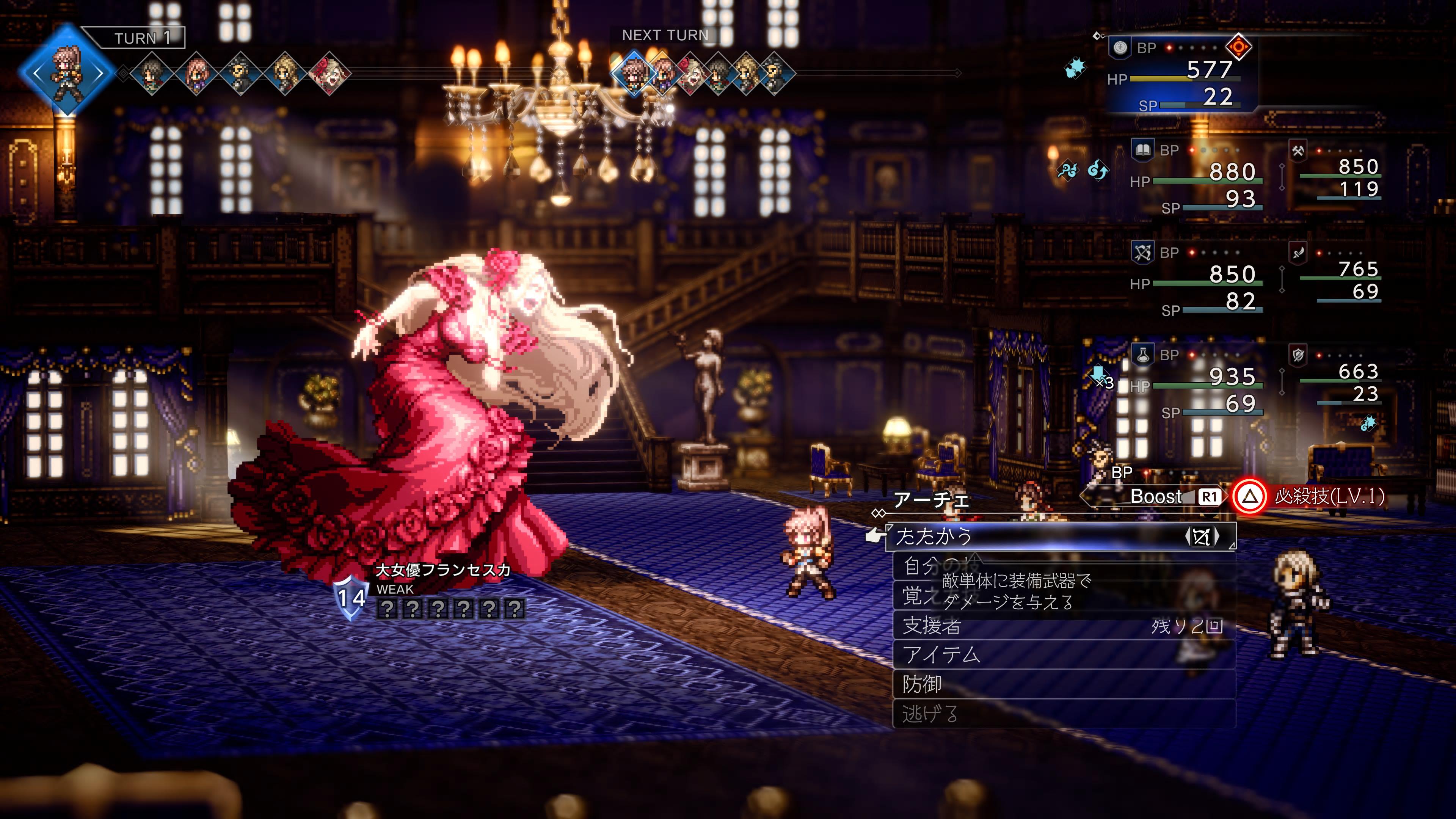- また味方はターンが回ってくる旅に、BPというポイントが1つずつ加算されます。行動時にBPを最大3つ消費することで、行動の効果(攻撃行動なら与ダメージ、回復行動なら回復量、バフデバフなら継続ターン数)を大きく増加することが出来ます。よって、シールドブレイク時にBP消費行動を重ねることで、敵のHPをごっそり削ることが出来ます。とはいえそれぞれのキャラが扱える属性は限られていますし、行動順にもランダム要素があるので、狙ったタイミングでシールドブレイク出来るわけではありません。攻撃力は低いが多段ヒットするアビリティを持つキャラでシールドを削り、その間にサポートキャラでアタッカーを強化し、ブレイクしたところでアタッカーが全火力を集中して削る、これがうまく決まると本当に気持ちよかったです。