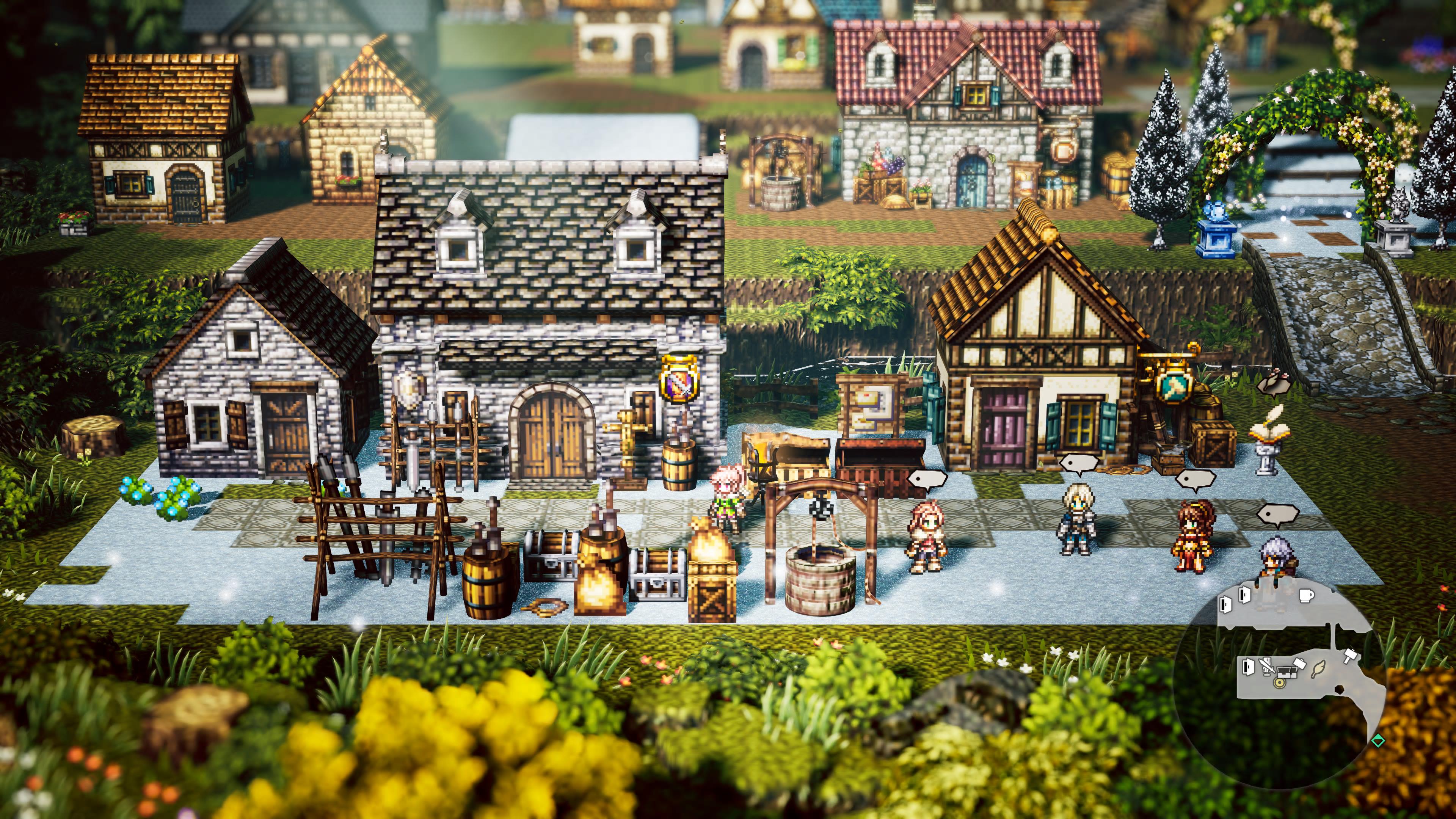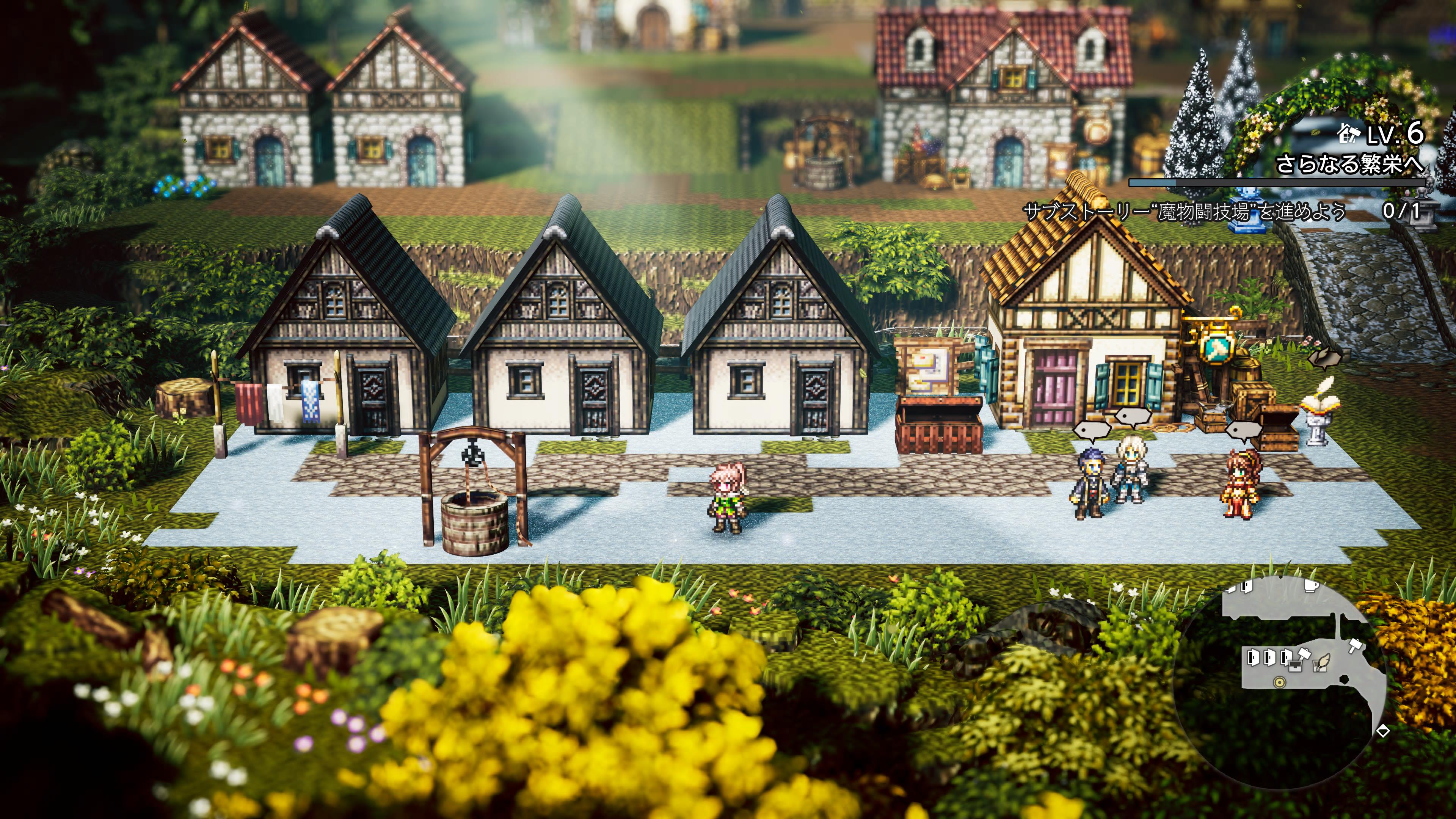 - また今作の新要素として、タウンビルドがあります。建物やキャラクターを自由に配置し、主人公の故郷ウィッシュベールを復興していくのですが、これとHD-2Dの相性が抜群でしたね。yukkun20はクリエイティビティの乏しい人間なので、例えばマイクラのような自由度が高いタウンビルドは苦手なのですが、本作のタウンビルドは2D上のマップに建物を設置していくというある種制限的なものですし、カメラも固定なのでカメラ方向からの見栄えだけを気にしていればいいですし、HD-2Dで作られた美しい建物をポンポン並べるだけでそれなりの見た目になります。