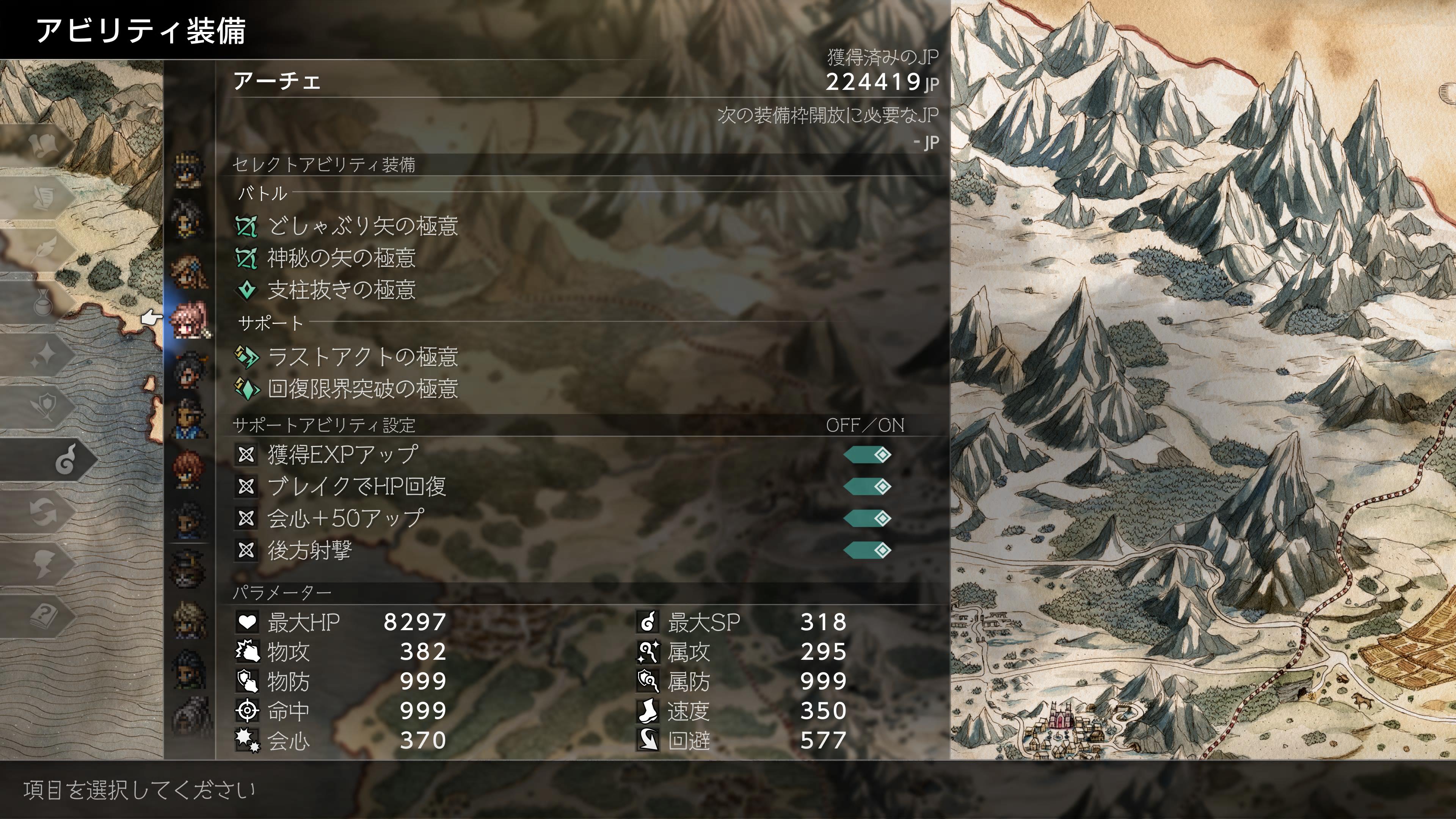 - また各キャラクターは、「バトルアビリティ」(いわゆる戦闘スキル)を3つ、「サポートアビリティ」(いわゆるパッシブスキル)を2つ装備出来るようになっています。各キャラクターは同じ職業に就いていても微妙に使い勝手に差があるのですが、これによりその差を埋めたり、あるいは長所をさらに伸ばしたり、補助的な役割を担わせたりすることができるようになっています。一撃が思いキャラに多段攻撃を持たせてシールドを削りやすくしたり、行使出来る属性の幅を広げて多様な敵に対応出来るようにしたり、サポートキャラに回復技を持たせて支援の幅を広げたりといろいろできます。他方で装備出来ないそのキャラ固有のアビリティもありますし、また装備出来る武器は各キャラ固定で変更出来ないなど、キャラの差別化も損なうことないシステムとして成立していました。