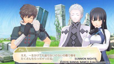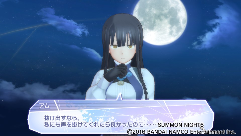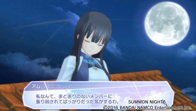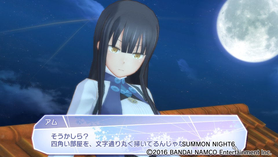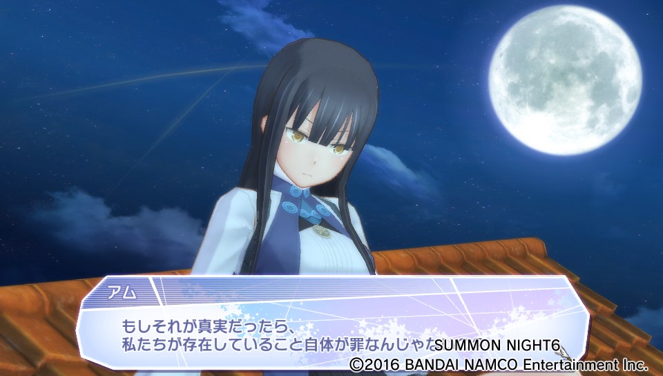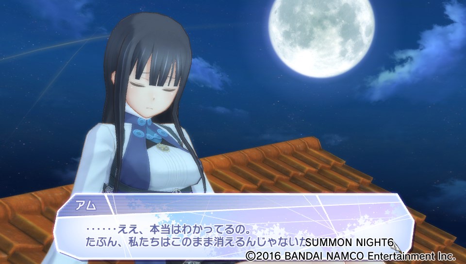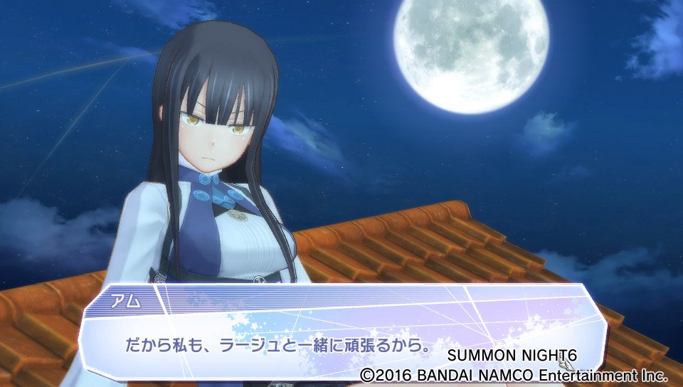 こうやって月の明かりの下、屋根に座っていると、サモンナイトの夜会話だなーって思いますね。っていうかやっぱり座ってたんだな。過去作だとバストアップしか映らないから立ってるのか座ってるのかわからないし。