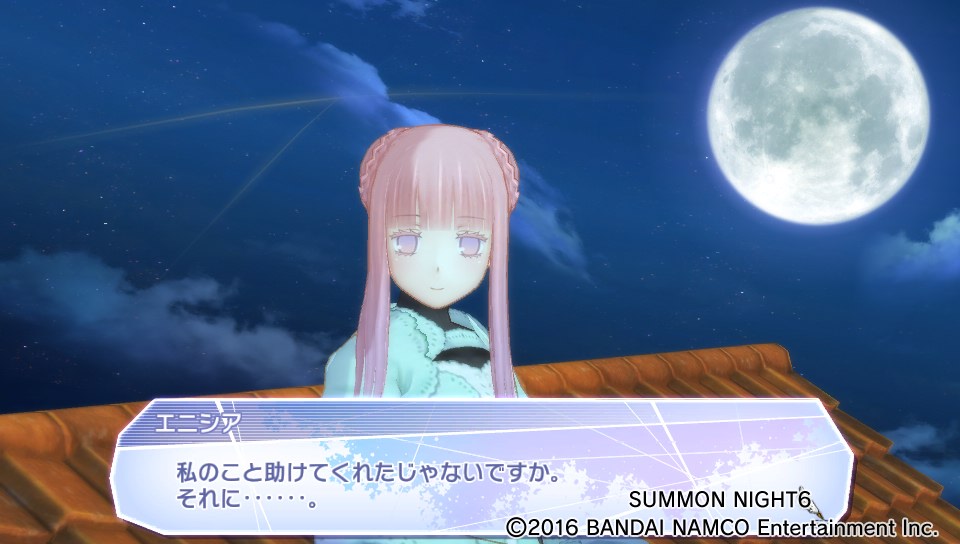 屋根の上からみんなの様子を眺めるエニシア。賑やかな様子にエニシアも幸せそう。