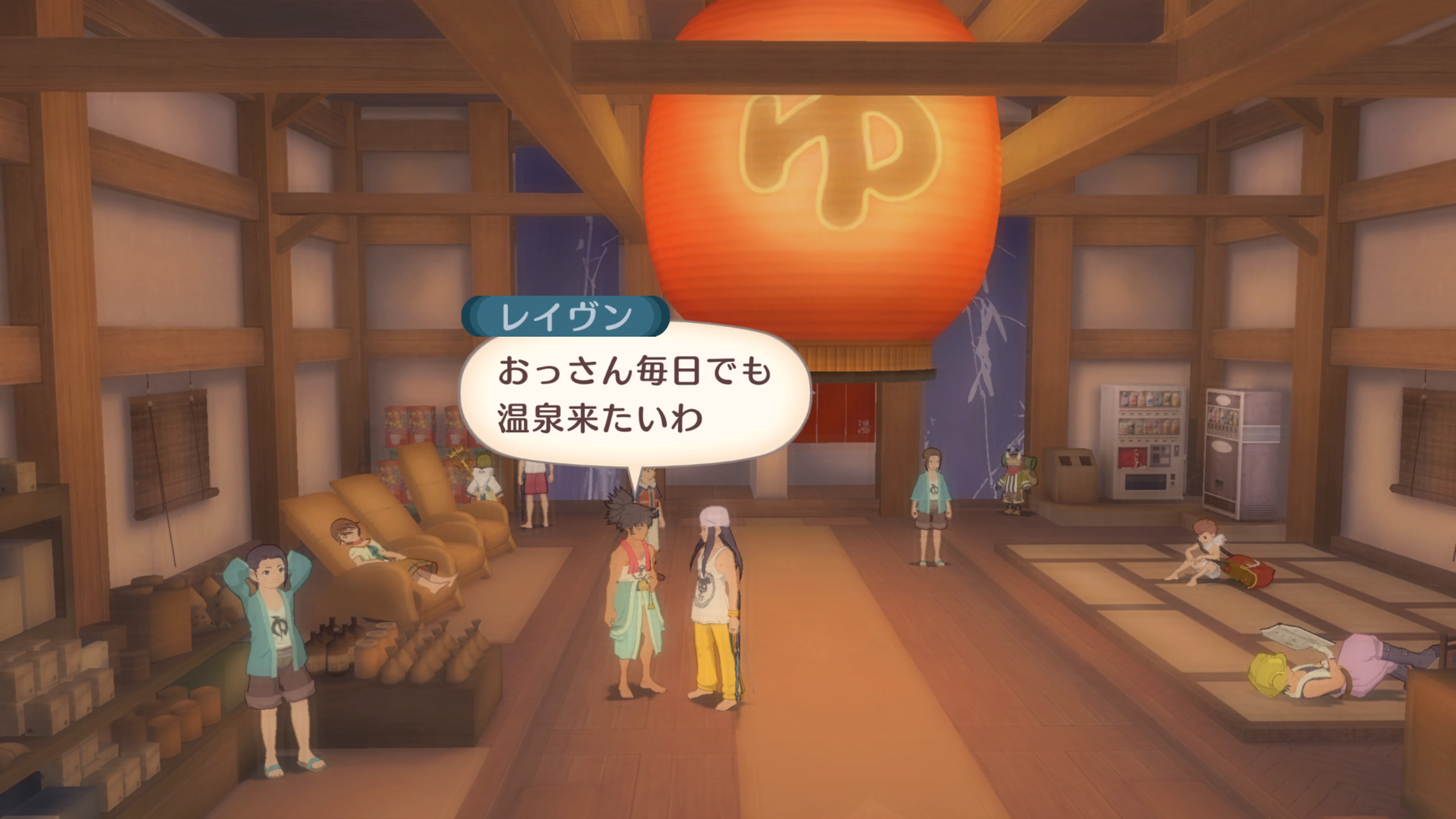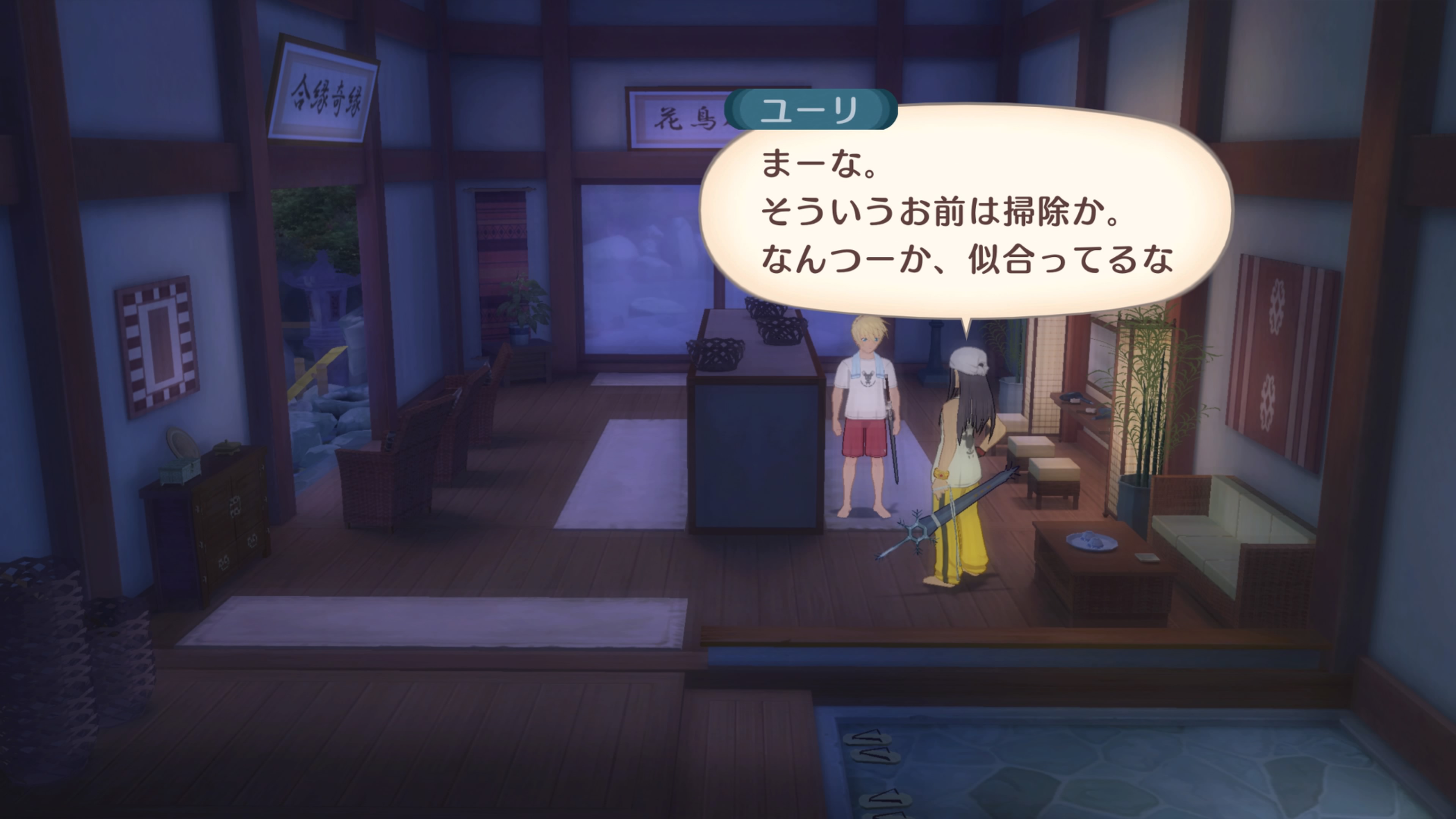 再び入浴に来たら今度は清掃中でした。営業時間とは。レイヴンが余計な一言を言ったせいで、少しでも早く開店できるよう掃除を手伝わされることになります。カロルが。「そんなの無理やりすぎるよ!」とはごもっとも。
